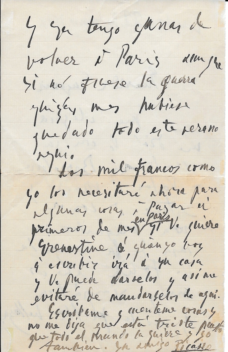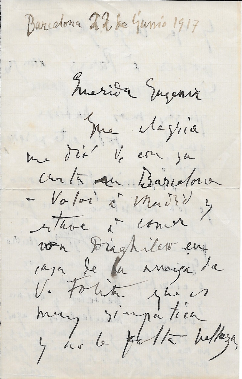 Rare lettre de Pablo Picasso durant la première guerre mondiale. Réfugié chez lui à Barcelone, il reçoit Serge Diaghilev dans le cadre de sa collaboration aux mythiques Ballets russes. C’est à l’initiative d’Eugenia Errazuriz que Picasso est présenté à Serge Diaghilev, qui lui commande des décors pour ses Ballets. Tandis qu’il travaille sur le ballet à Rome, l’artiste espagnol tombe amoureux de la danseuse Olga Khokhlova. Ils se marient en 1918. De leur union nait le premier fils du peintre, Paulo : « Chère Eugenia Quelle joie vous m’avez donnée avec votre carte à Barcelone. Je suis retourné à Madrid et je suis allé manger avec Diaghilev dans la maison de l’amie de V. Folita qui est très sympathique, et ne manque pas de beauté et j’ai déjà envie de rentrer à Paris. Si ce n’était pas la guerre, peut-être serais-je resté ici tout l’été. Les mille francs comme je vais les nécessiter maintenant pour quelques choses à payer le premier du mois à Paris. Si vous le voulez Ernestine à qui je vais écrire, ira à votre maison et vous pourrez les lui donner et ainsi m’éviterez de les lui envoyer depuis ici. Ecrivez moi et racontez moi des choses, et ne me dites pas que vous êtes triste, alors que tout le monde vous aime et moi aussi. Votre ami Picasso »