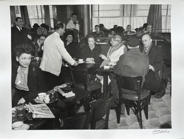 Superbe photographie d’ambiance au café de Flore en 1939, où l’on aperçoit au milieu de la salle le maître espagnol surpris en pleine conversation complice avec une jeune femme.