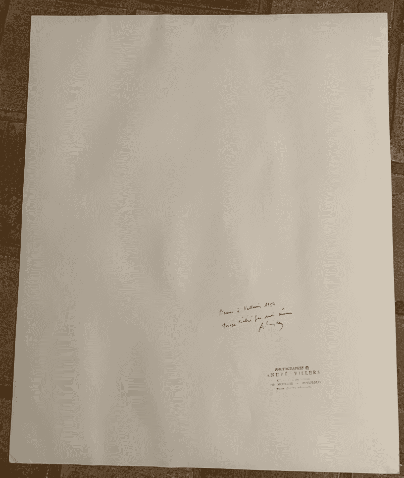 Tirage argentique par André VILLERS (1930 – 2016), 52 x 42 cm, signé en bas à droite, tamponné et annoté au dos par le photographe :  » Picasso, Cannes 1956 Tirage  réalisé par moi-même A. Villers »