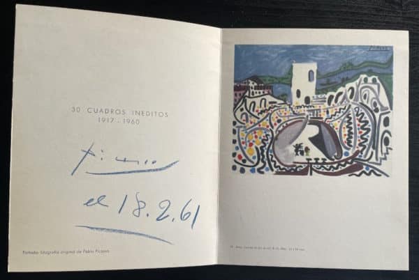 Lithographie de Pablo Picasso imprimée sur vélin d’Arches à 4 volets illustrée d’une œuvre en couleur de 1960 du maître intitulée « Corrida en dia de sol ». Second volet signé au crayon de couleur bleu par Picasso et daté (el 18.2.61)