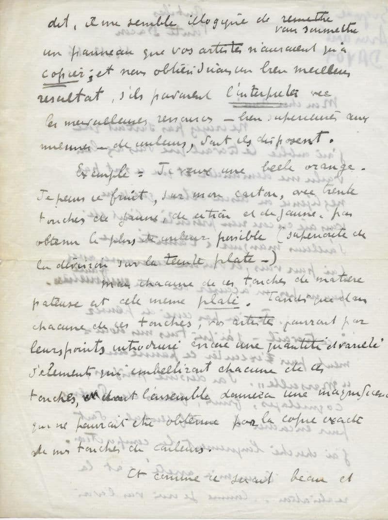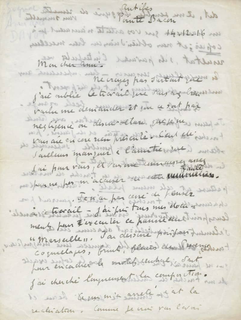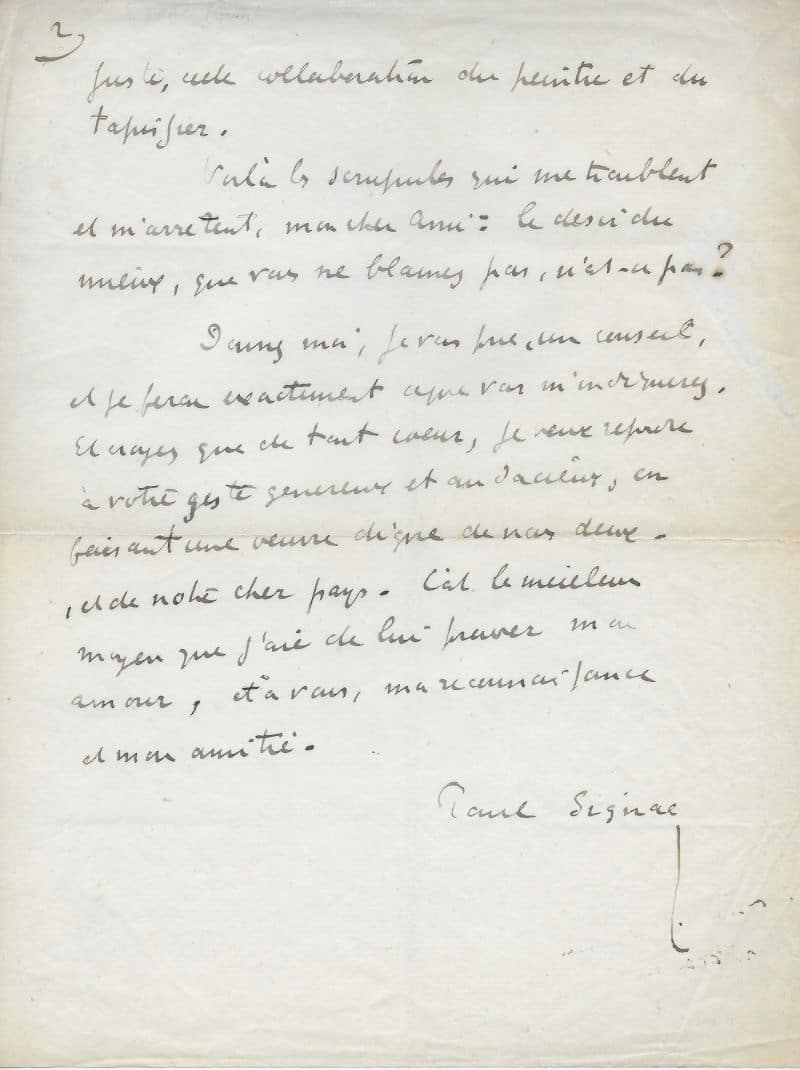 Belle lettre de Signac réfléchissant à la meilleure collaboration possible entre le peintre et le tapissier pour la réalisation d’une œuvre en hommage à Marseille : « Ne croyez pas surtout que j’ai oublié le travail que vous avez bien voulu me demander et que ce soit par négligence ou désinvolture que je ne vous aie encore rien présenté. C’eut été d’ailleurs manquer à l’amitié que j’ai pour vous, et vous me connaissez assez pour ne pas m’accuser de cette faute. Je n’ai pas cessé de penser à ce travail – j’ai pris tous mes documents pour exécuter ce panneau « Marseille ». J’ai dessiné poissons, coquillages, fruite, fleurs de Provence pour encadrer le motif central, dont j’ai cherché longuement la composition. Ce qui m’a arrêté c’est la réalisation. Comme je crois vous l’avoir dit, il me semble illogique de vous soumettre un panneau que vos artistes n’auraient qu’à copier ; et nous obtiendrons un bien meilleur résultat, s’ils pouvaient l’interpréter avec les merveilleuses ressources – bien supérieures aux miennes – de couleurs, dont ils disposent. Exemple : Je veux une belle orange. Je peins ce fruit, sur mon carton, avec trente touches de jaune, de citron et de jaune – pour obtenir le plus de couleur possible (supériorité de la division sur la teinte plate-) Mais chacune de ces touches de matière pâteuse est elle-même plate. Tandis que dans chacune de ces touches, vos artistes pourraient par leurs points introduire encore une quantité de variété d’éléments qui embellirait chacune de ces touches, l’ensemble donnera une magnificence qui ne pourrait être obtenue par la copie exacte de nos touches de couleurs. Et comme ce serait beau et juste cette collaboration du peintre et du tapissier. Voilà les scrupules qui me troublent et m’arrêtent, mon cher ami : le désir du mieux, que vous ne blâmez pas, n’est-ce pas ? Donnez moi, je vous prie, un conseil, et je ferai exactement ce que vous m’indiquerez. Et croyez que de tout cœur, je veux répondre à votre geste généreux et audacieux, en faisant une œuvre digne de nous deux – et de notre cher pays. C’est le meilleur moyen que j’aie de lui prouver mon amour, et à vous, ma reconnaissance et mon amitié… »