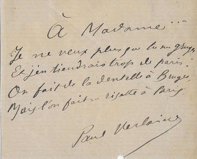 Amusant quatrain de Verlaine qui vilipende sa maîtresse Philomène Boudin de toutes les misères qu’elle lui inflige :