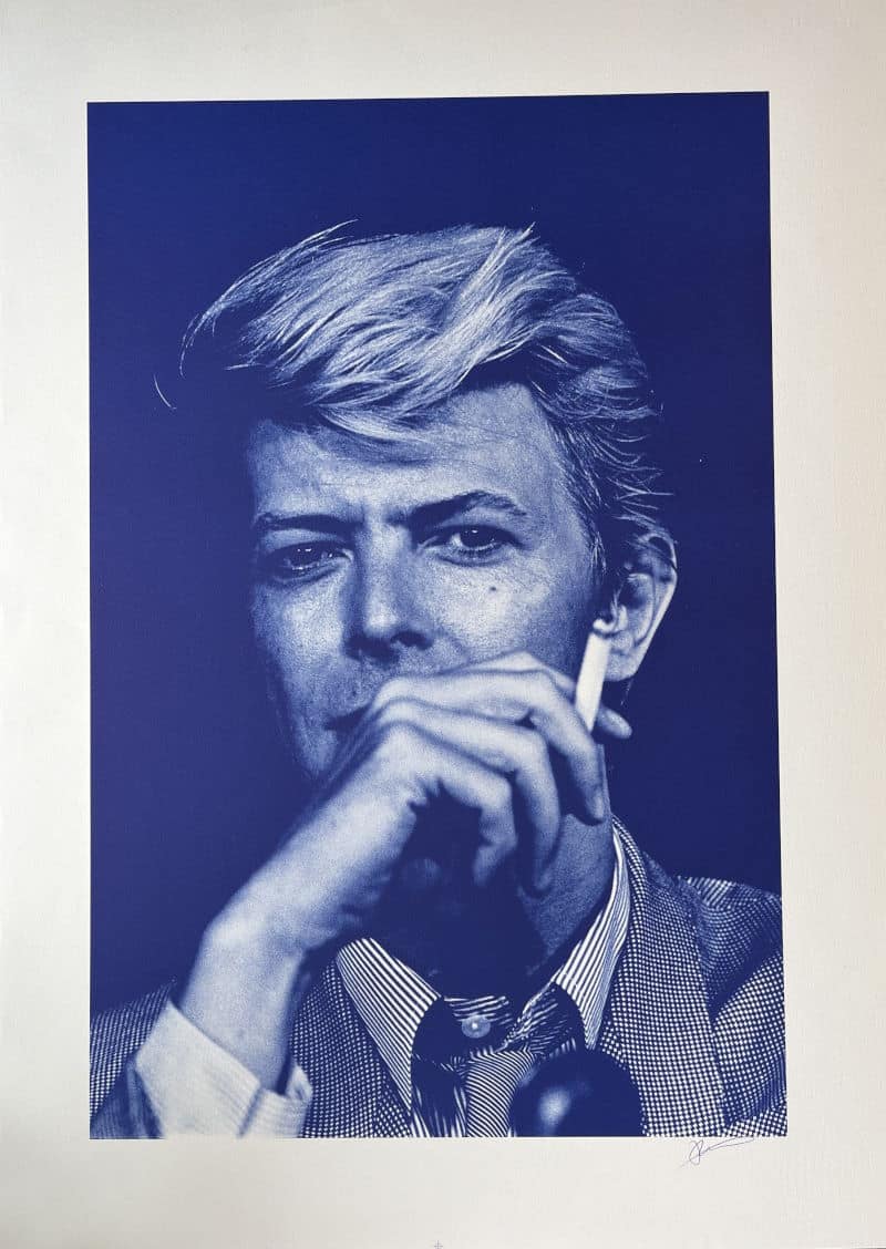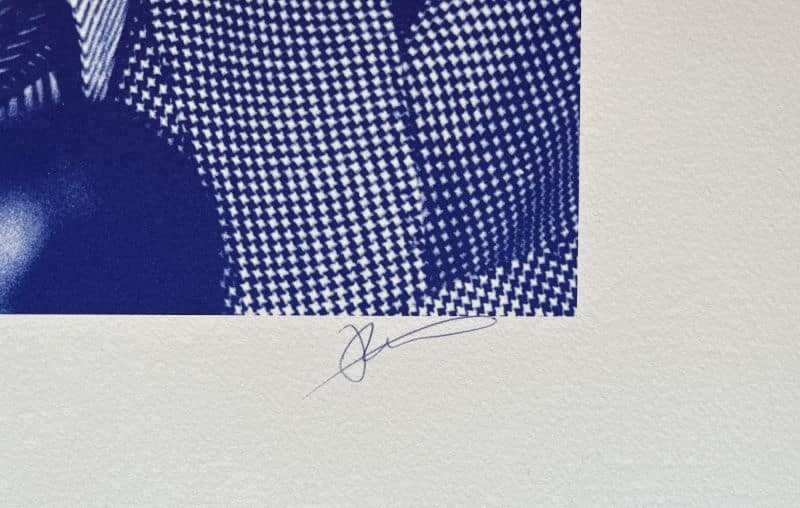 Photo impression lithographique signée 71,5 x 51,2 cm sur papier bleu foncé. Beau portrait art du célèbre chanteur britannique.