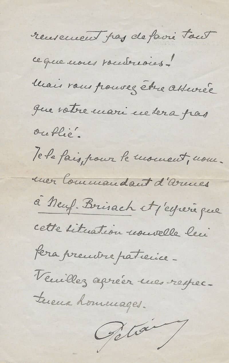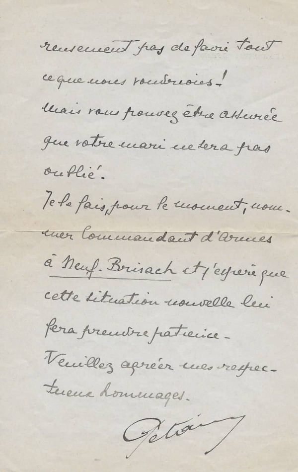 Le colonel Horace-Philippe Hepp, grand blessé de guerre, amputé d’une jambe, est en quête d’un poste dans l’armée française qui redonnerait du piment à sa carrière. Il envoie son épouse, solliciter le maréchal Pétain qui l’a bien connu durant le conflit : « Madame, Je comprends fort bien les sentiments qui vous ont incité à m’écrire et c’est bien volontiers que je me suis enquis de ce qui pouvait être fait pour le colonel Hepp. Le grand nombre d’officiers généraux et supérieurs disponibles à la suite de la dissolution des unités ne nous permet malheureusement pas de faire tout ce que nous voudrions ! Mais vous pouvez être assurée que votre mari ne sera pas oublié. Je le fais, pour le moment, nommer Commandant d’armes à Neuf-Brisach et j’espère que cette situation nouvelle lui fera prendre patience… »