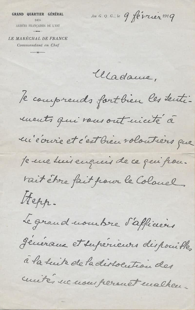 Lettre autographe signée à Madame la colonel Hepp. 9 février 1919 ; 2 pages in-8° oblong sur papier en-tête « Grand quartier général (…) le Maréchal de France Commandant en Chef ».