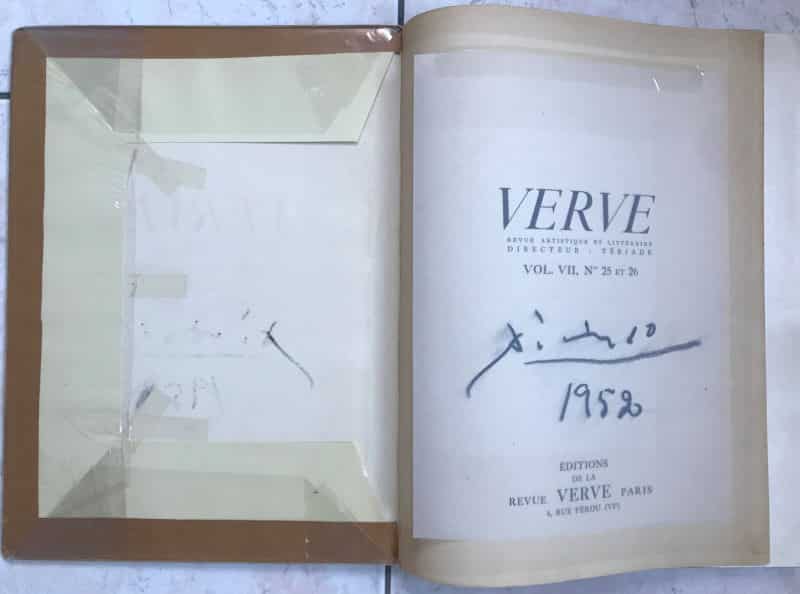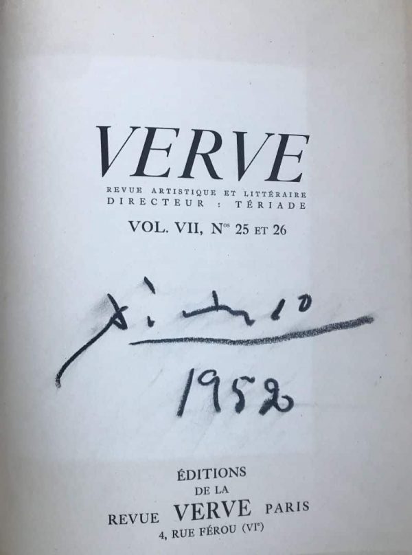 Livre signé, daté (l952) au crayon gras noir sur la page de garde du livre intitulé « Verve » (page de garde protégée par une feuille transparente montée sur onglet).