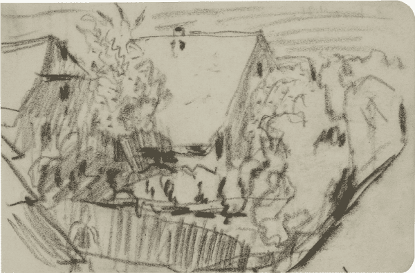 Dessin original au fusain sur papier, 10 x 15 cm. le sujet représente la » Maison des Carrières », bicoque paysanne au-dessus d’un ravin herbu en bord de Seine, que Bonnard loua de 1907 à 1912 à Vernouillet. Il partit par la suite à Vernonnet où il acheta une maison.