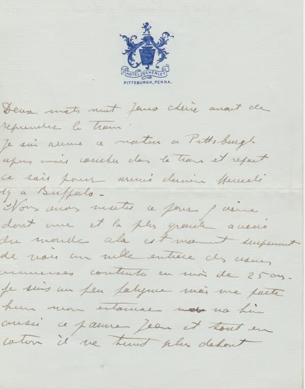Lettre autographe signée « Louis » à sa maitresse Jeanne Hatto. Pittsburgh (1911) ; 2 pages in-8° sur papier en-tête « Hotel Schenley Pittsburgh… »