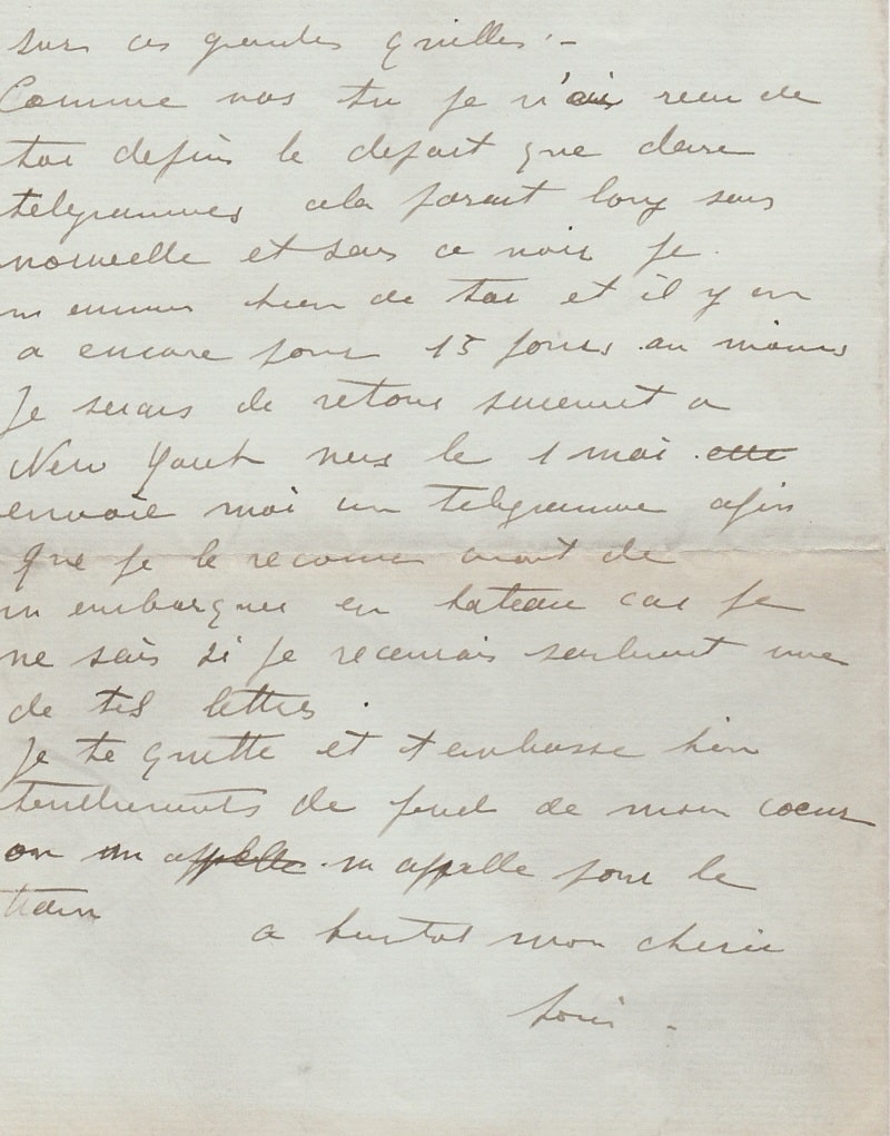En 1911 Louis Renault part aux Etats-Unis apprendre les méthodes industrielles du constructeur automobile Henri Ford, il entretient à cette époque une liaison avec la cantatrice Jeanne Hatto : « Deux mots Jano chérie (Jeanne Hatto) avant de reprendre le train. Je suis arrivé ce matin à Pittsburgh après (des) mois couché dans le train et repart ce soir pour arrivé demain mercredi 19 à Buffalo. Nous avons visité ce jour 5 usines dont une est la plus grande aciérie du monde cela est vraiment surprenant de voir une ville entière des usines immenses construite en moins de 25 ans. Je suis un peu fatigué mais me porte bien mon estomac va bien aussi ce pauvre Jean est tout en coton il ne tient plus debout sur ces grandes quilles. Comme vas-tu je n’ai rien de toi depuis le départ que deux télégrammes cela parait long sans nouvelle et sans ce voir. Je m’ennuie bien de toi et il y en a encore pour 15 jours au moins. Je serais de retour surement à New York vers le 1 mai. Envoie moi un télégramme afin que je le reçoive avant de m’embarquer en bateau car je ne sais si je recevrai seulement une de tes lettres. Je te quitte et t’embrasse bien tendrement du fond de mon cœur. On m’appelle pour le train à bientôt mon chérie. Louis »