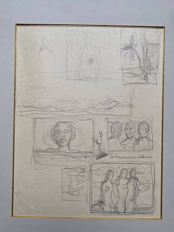 Riche dessin du maître surréaliste belge, qui nous invite à un voyage dans son monde onirique, où s’esquisse un corps de femme sur plusieurs cases, un visage féminin pensif, suivi de trois hommes conversant, puis d’un nu féminin enveloppé de nuages, pour s’achever par trois femmes nues, devisant, dans un paysage nuageux, où l’on peut apercevoir au loin des collines.