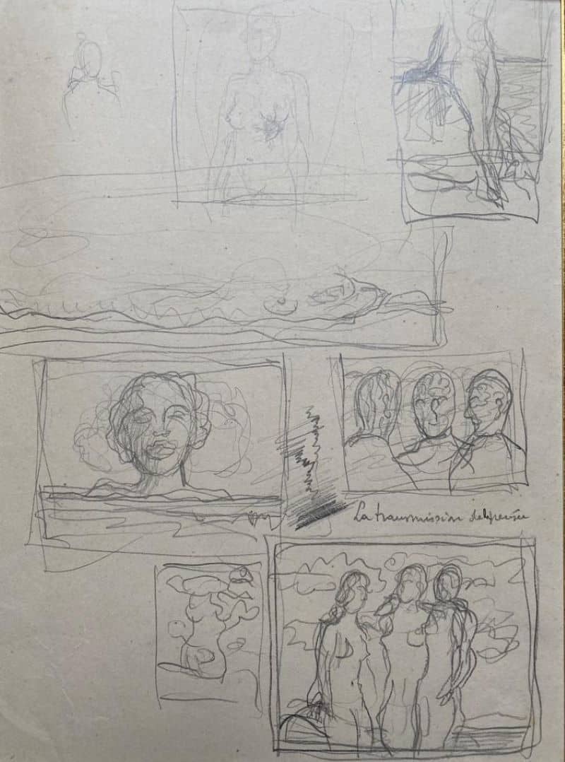 Dessin à la mine de plomb sur papier non signé, titré en bas à droite « La transmission de pensée ».