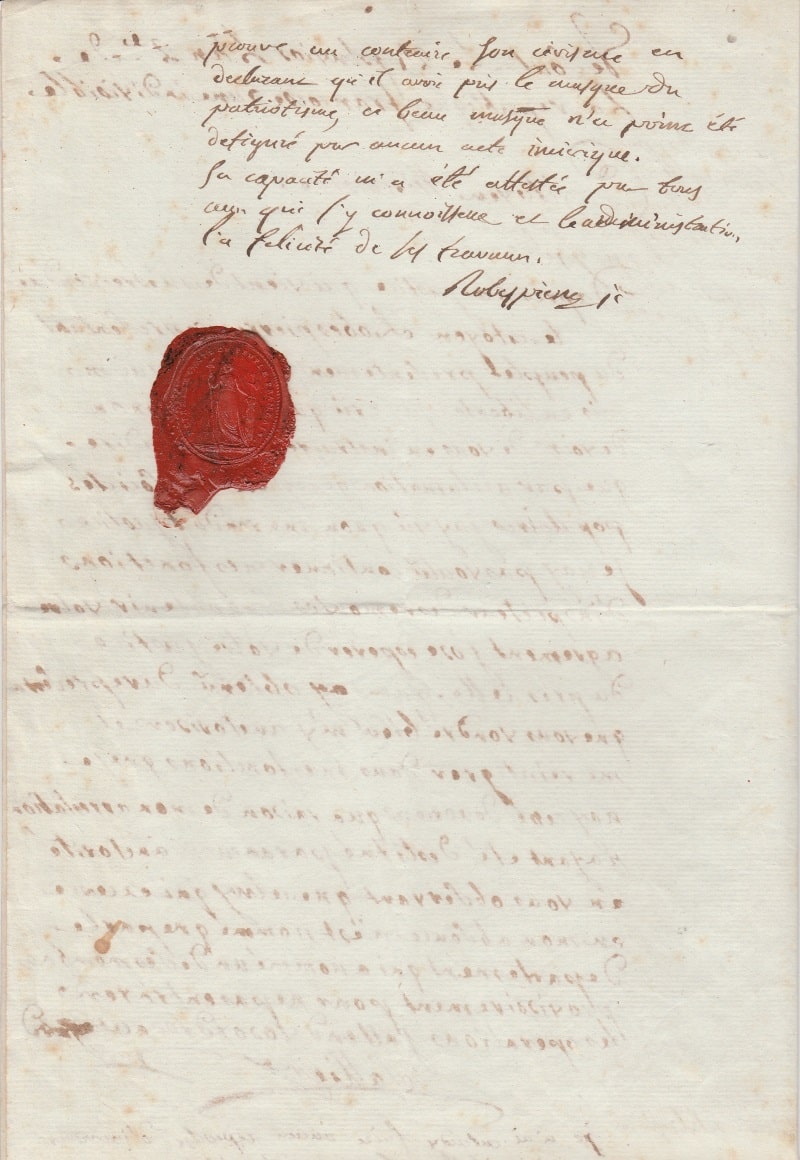 Beau document d’histoire concernant la mise en liberté par Robespierre jeune du citoyen Sallier qui demande à être réintégré dans ses fonctions. Robespierre ajoute de sa main : « Je n’ai entendu faire aucun reproche d’incivisme au citoyen Sallier, le motif d’arrestation de ce citoyen prouve au contraire son civisme en déclarant qu’il avoit pris le masque du patriotisme, ce beau masque n’a point été défiguré par aucun acte incivique. Sa capacité m’a été attestée par tous ceux qui s’y connoissent et l’administration l’a félicité de ses travaux ».
