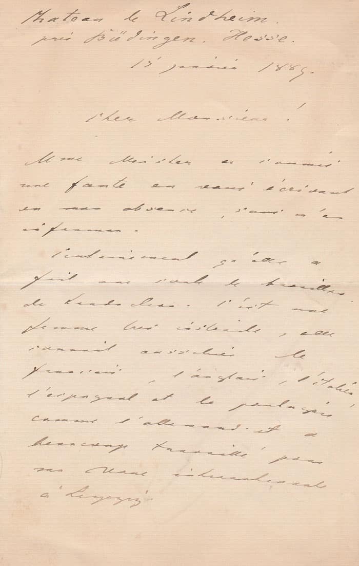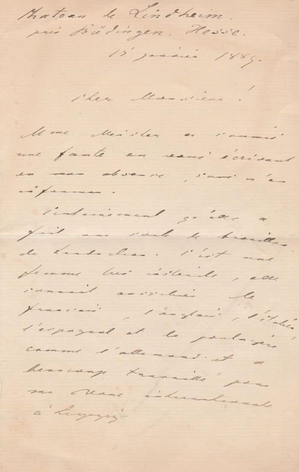 Lettre autographe signée à son éditeur français. Bateau le Lindheim pris à Büdingen (Allemagne) 15 janvier 1885 ; 3 pages in-8°.