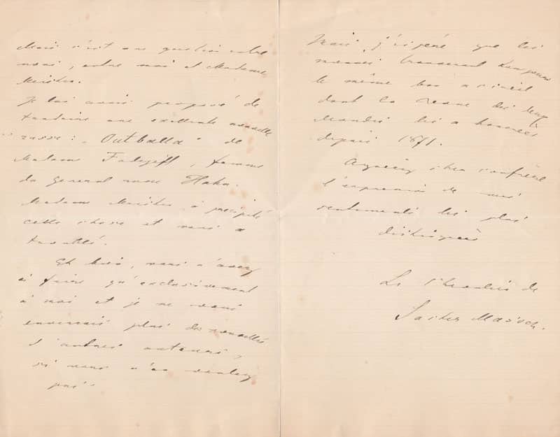 Il fait remarquer que la traductrice de ses romans, Mme Meisler, a commis une faute mais malgré tout c’est une bonne traductrice qui sait le français, l’anglais, l’italien, l’espagnol et le portugais comme l’allemand et qui a fait ses preuves. Il lui avait proposé de traduire une nouvelle russe : « Outballa » de Madame Fadejeff, femme du général russe Hahn qu’elle a exécutée aussitôt. Il avertit son éditeur français qu’à l’avenir il n’aura à faire qu’exclusivement à lui et qu’il n’enverra plus des nouvelles d’autres auteurs s’il n’en veut plus. Enfin, il espère qu’un bon accueil lui sera réservé.