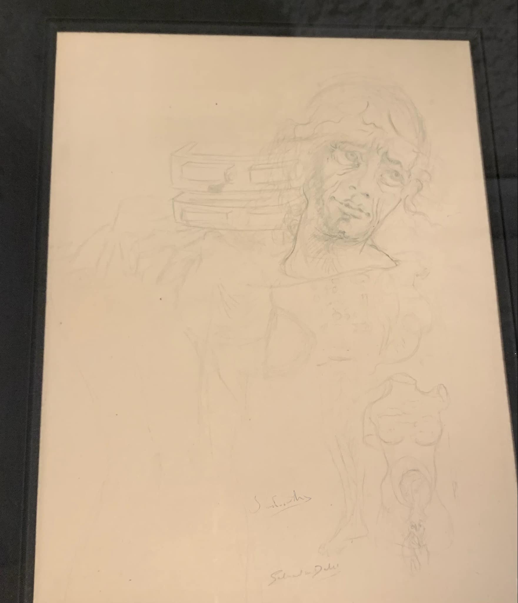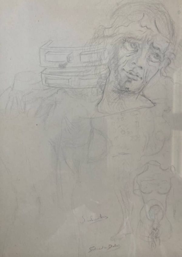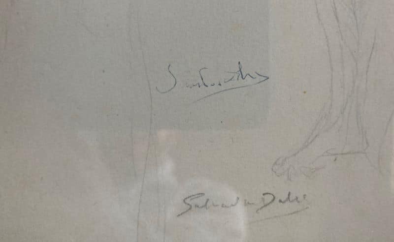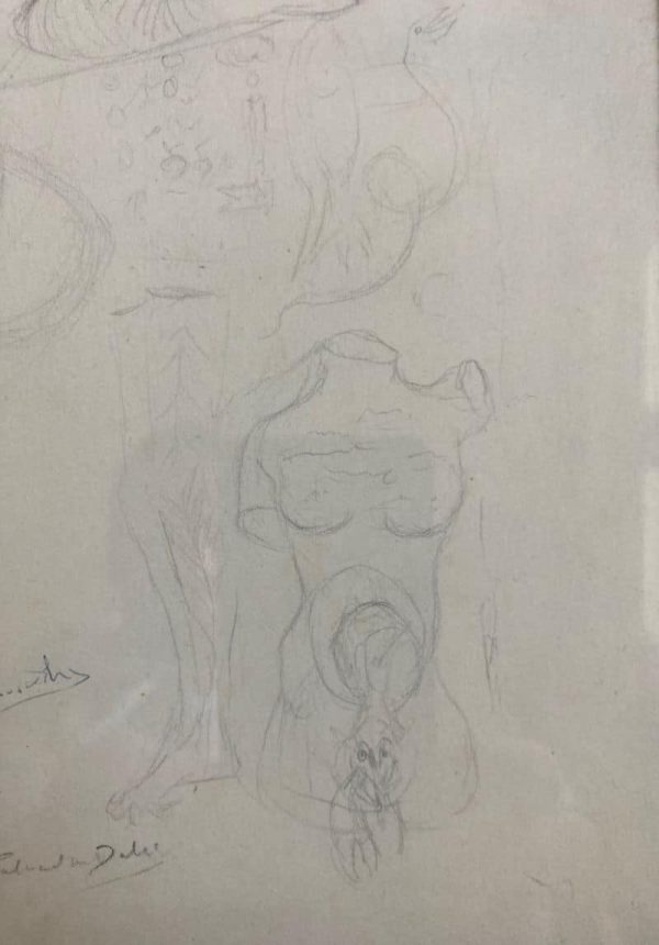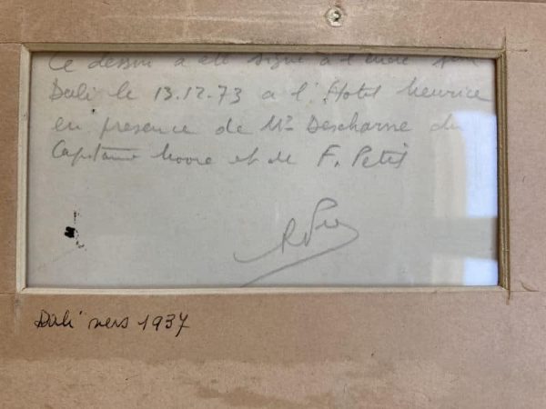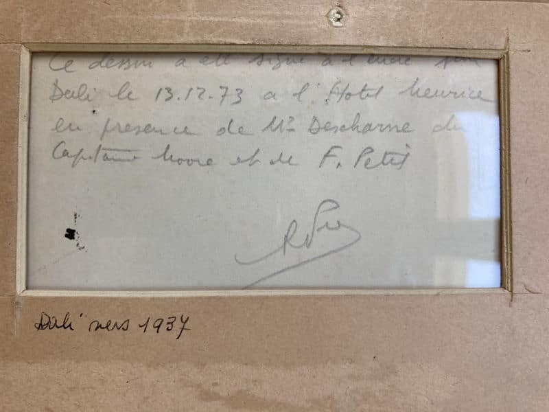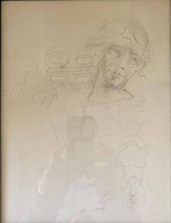 Dessin original à la mine de plomb sur papier, 27 x 21 cm, signé au crayon en bas vers le milieu et contresigné à l’encre en 1973 à l’Hôtel Meurice en présence, selon un encart au dos du dessin, de Monsieur Robert Descharnes, photographe, ami et collaborateur de Dali, du Capitaine Moore, de son nom patronimique John Peter Moore, capitaine de l’armée britannique et secrétaire particulier du peintre pendant douze ans, et du galeriste et propriétaire du dessin André-François Petit.