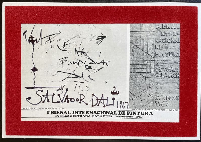Superbe pièce réalisée sous la direction de Dali présentant la Biennale internationale de peinture espagnole à la galerie Mundi-Art à Barcelone « Bienal Buenos dias Dali 1967 ». Document encadré sous un passe-partout de feutre rouge d’origine.