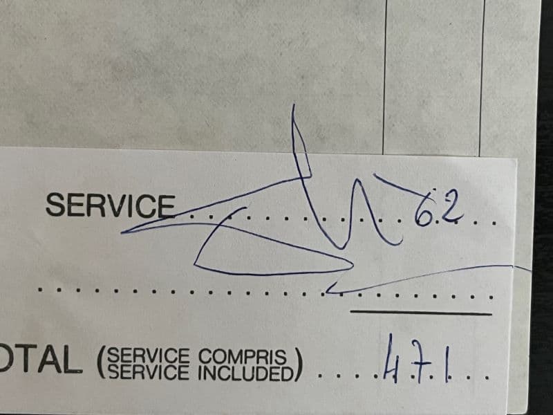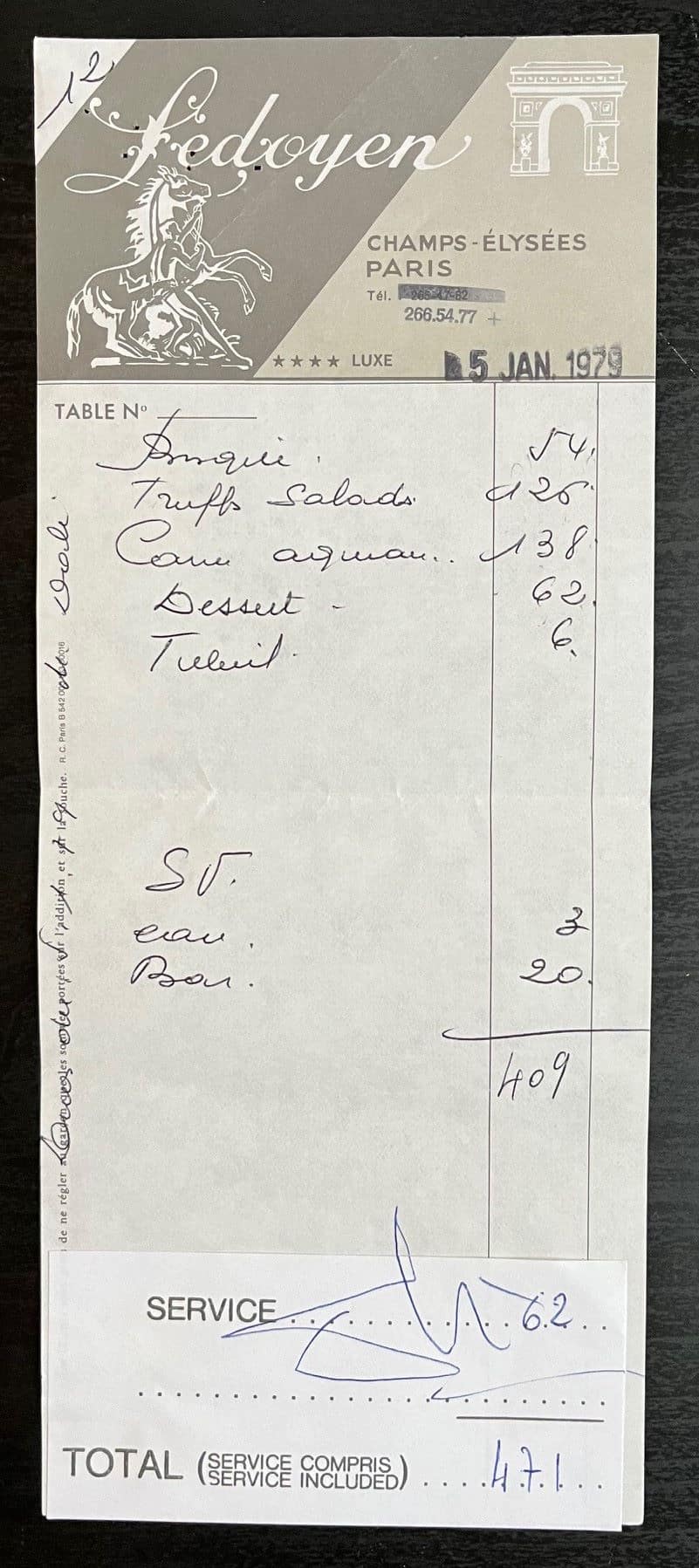 Note du restaurant Ledoyen, situé aux Champs-Elysées, signé par Salvador Dali au stylo à bille bleu. Annotation en marge indiquant que la note était celle de Dali le 5.1.79