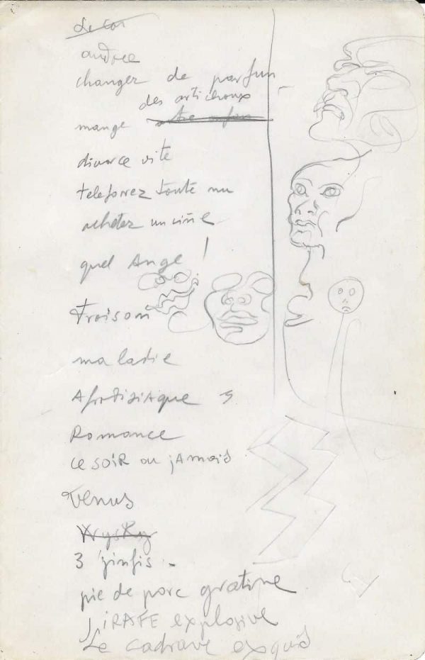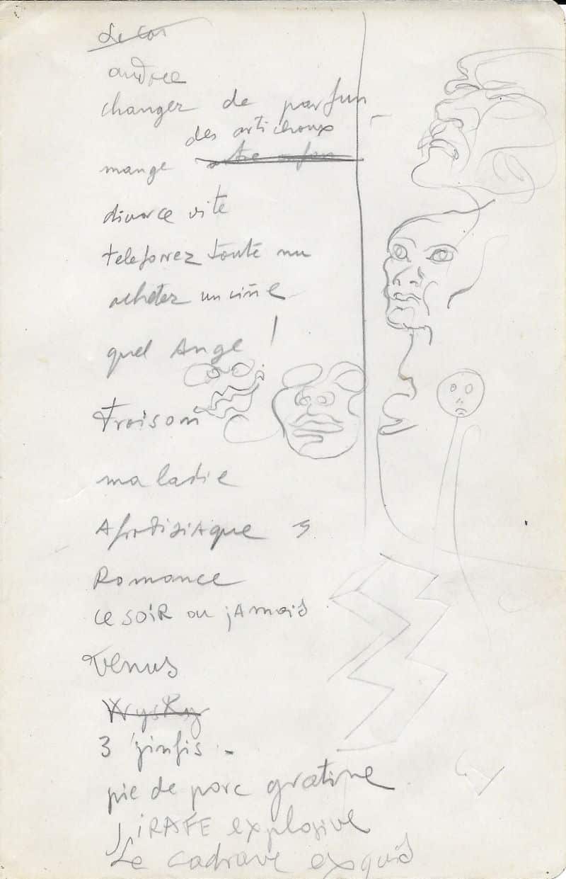 Le Cadavre Exquis : « audace / changer de parfum / manger des artichauds / divorcer vite / téléphoner toute nue / Quel ange ! / Frissons / maladie / Aphrodisiaques / Romance / Ce soir ou jamais / Vénus / Whisky (barré) / 3 ginfis / pied de porc gratiné / GIRAFE explosive / Le cadavre exquis »