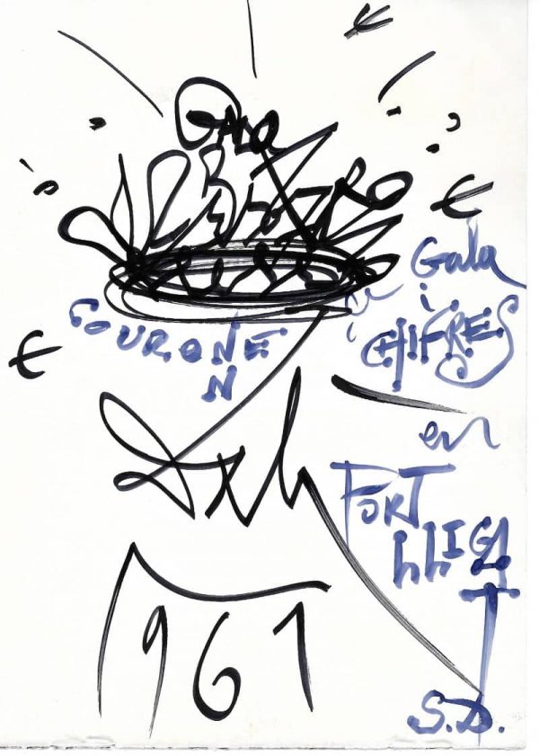 Belle pièce fort graphique exécutée aux feutres noirs et bleus représentant la couronne du « roi » Dali avec au sommet le nom de sa muse Gala. Dessin brillamment exécuté en un trait de l’amorce de la couronne jusqu’à la signature, trois hirondelles tournoyant autour de la couronne, datée (1961) et signée deux fois dont une de ses initiales. Dali a mentionné à nouveau le nom de sa femme Gala, et les mots « couronne, Chifres en Port Lligat »