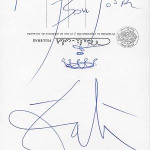Pièce autographe signée deux fois agrémentée d’un dessin d’une couronne. Port Lligat (Cadaqués – Espagne), 1961 ; 1 page in-8°.