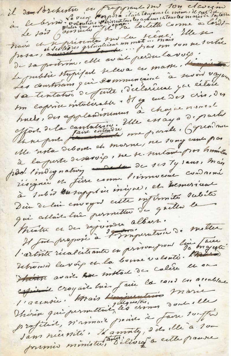Une page manuscrite raturée avec de multiples corrections : « (…) dans l’orchestre en frappant sur son clavecin à le briser (…) Le soir Consuelo fit sa toilette comme à l’ordinaire et se présenta sur la scène. Elle se posa et ses lèvres articulèrent un mot…mais pas un son ne sortit de sa poitrine. Elle avait perdu sa voix. Le public stupéfait se leva en masse. Les courtisans qui commençaient à savoir voyant sa tentative de fuite, déclarèrent que c’était son caprice intolérable. Il y eut des cris, des hués, des applaudissements à chaque nouvel effort de la cantatrice. Elle essaya de parler et ne put faire entendre une parole. Cependant elle resta debout et morne, ne songeant pas à la perte de sa voix, ne se sentant pas humiliée par l’indignation de ses tyrans, mais résignée et fière (…) condamnée à subir supplice inique, et remerciant Dieu de lui envoyer cette infirmité subite qui allait lui permettre de quitter le théâtre et de rejoindre Albert. Il fut proposé à l’Impératrice de mettre l’artiste récalcitrante en prison pour lui faire retrouver la voix et la bonne volonté. Sa majesté avait (…) des colères et on croyait lui faire la cour en accablant l’accusée. Mais Marie Thérèse qui permettait les crimes dont elle profitait, n’aimait point à faire souffrir sans nécessité (…) »