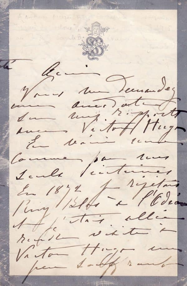 Sarah Bernhardt conte une anecdote sur VICTOR HUGO pour le « Gaulois » à l’occasion de la reprise d’« Angelo » au Théâtre Sarah Bernhardt : « Vous me demandez une anecdote sur mes rapports avec Victor Hugo. En voici une (…) En 1872 je répétais Ruy Blas à l’Odéon et j’étais allée rendre visite à Victor Hugo un peu souffrant. En causant avec lui je lui exprimai mon désir de jouer la Tisbé. Le Maître debout sur son pupitre, dessinait en parlant je ne sais quel burg. Il tomba soudain dans un fauteuil en s’esclaffant – si fort qu’il en perdit la respiration. Je dus lui passer un bol de vin chaud dans lequel baignait un rond de citron et sortait à demi telle une épave un bâton de canelle. – Je m’étais agenouillée devant lui ; il me tapota la joue. Il vous faudra mon enfant prendre des formes de la voix et des années. Mon rêve se réalisa 33 ans après. Le maître n’est plus là ; il est entré dans l’immortalité mais le reflet de sa belle âme le si fier doux et fidèle Paule Meurice est toujours là et j’ai senti grâce à lui que l’éclat de rire du grand maître était devenu un bienveillant et acquiesçant sourire… »