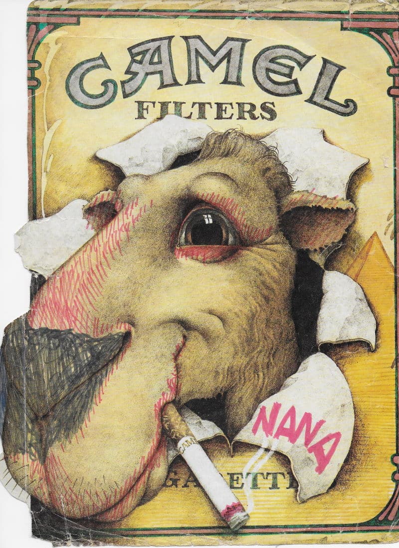 Le document est une page de magazine découpée, illustrant la fameuse publicité de la marque de cigarette Camel, avec pour emblème le dromadaire (camel en anglais), fumant une cigarette de la marque. Cette tête de dromadaire, au long museau allongé, n’était pas sans évoquer pour Gainsbourg, son chien bulle terrier « Nana », qui partageait la vie familiale du 5bis rue de Verneuil. Il prit alors un feutre rouge et réhaussa la tête du dromadaire de traits rouges en mentionnant le nom de son chien « Nana » en bas à droite.