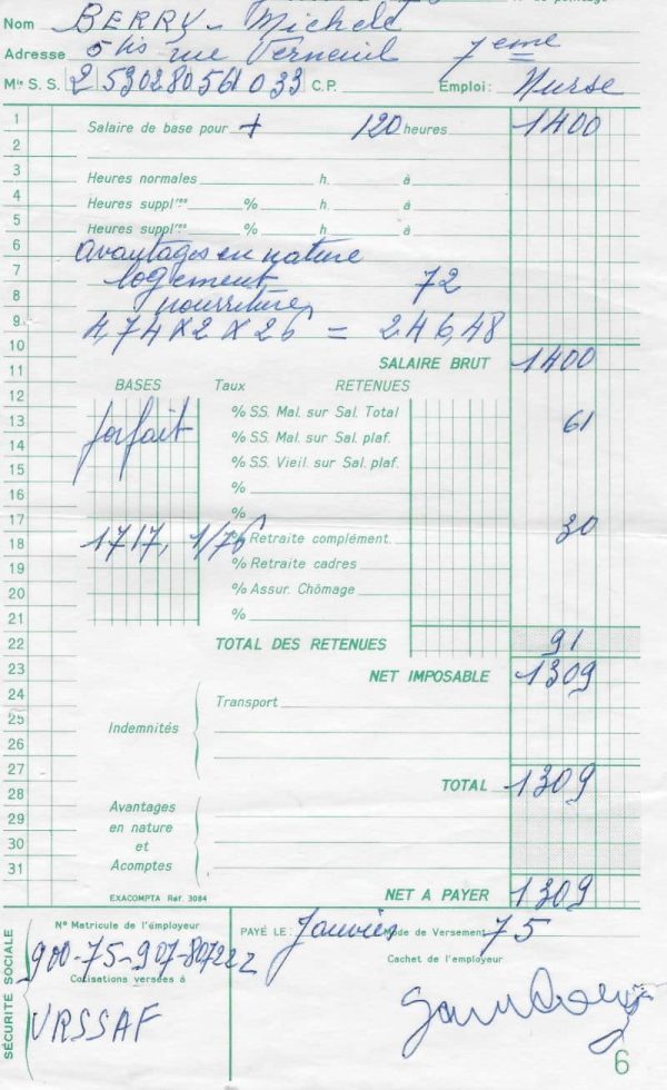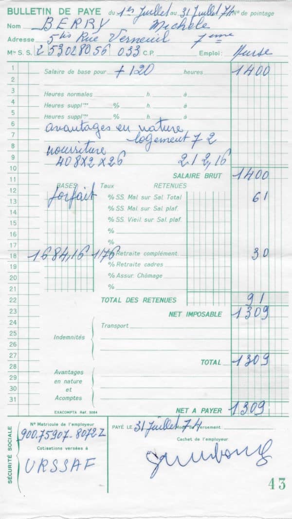 Bulletin de paye du règlement des congés en faveur de la nurse de Kate et Charlotte, Michèle Berry, signé par Gainsbourg du mois de juillet 1974.