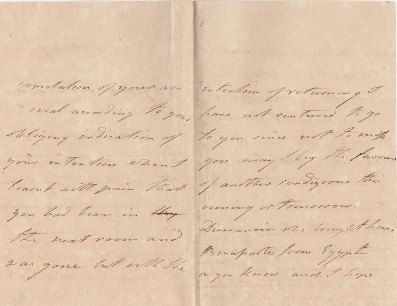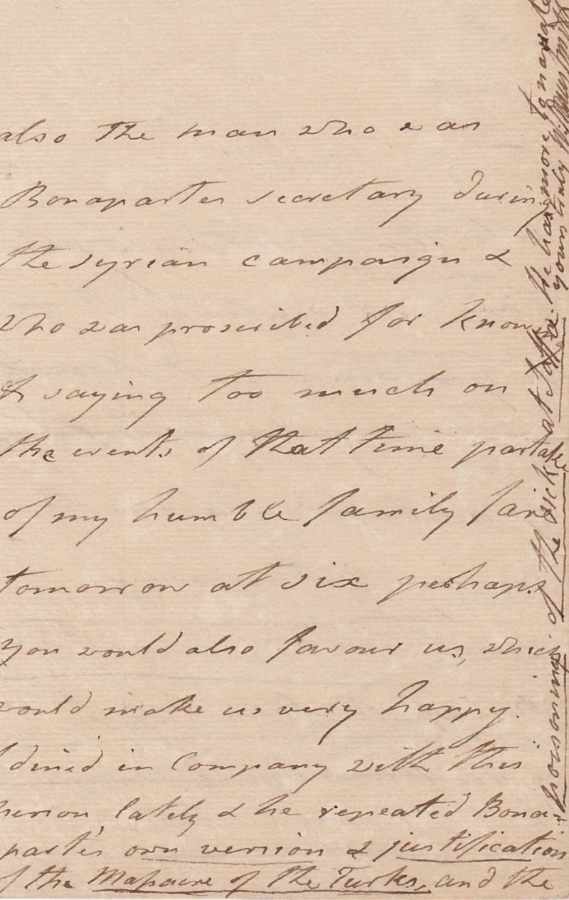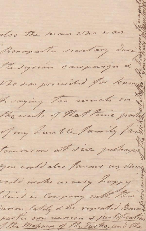 L’amiral qui est très probablement installé à Paris à la fin de sa carrière militaire déplore avoir manqué la visite de son cher Charles et lui propose une nouvelle rencontre, il précise que Dumanoir (Pierre Dumanoir le Pelley, vice-amiral 1770-1829) « qui ramena Bonaparte d’Egypte » ainsi qu’un ancien secrétaire de Bonaparte durant la campagne de Syrie (probablement Bourienne) « qui a été proscrit pour en savoir et en en avoir trop dit sur les évènements du moment » seront invités à dîner le lendemain et que son destinataire les rendrait fort heureux s’il acceptait de se joindre à eux. Il termine sa lettre en mentionnant avoir récemment dîné avec « Mr Denon » (sans doute Vivan-Denon) et que ce dernier « répétait la version et la justification donnés par Bonaparte sur le Massacre des Turcs et l’empoisonnement des malades (pestiférés) à Jaffa. Il en a encore à raconter »