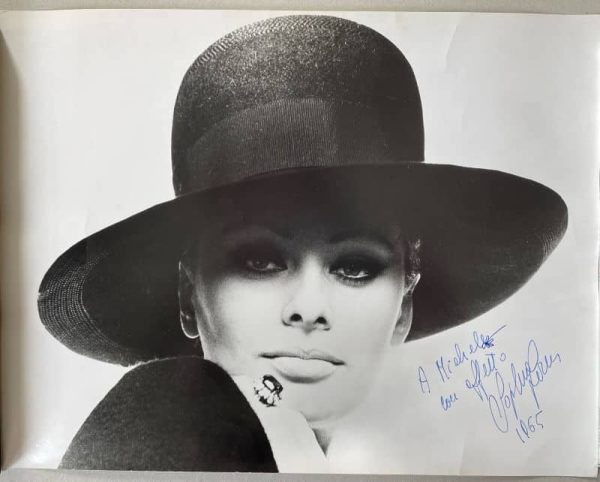 Tirage argentique de Sophia Loren affublée d’un chapeau au large bord, 30,4×29,9 cm, accompagnée d’une dédicace personnalisée ponctuée d’une fleur datée de 1965.