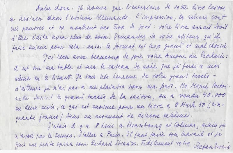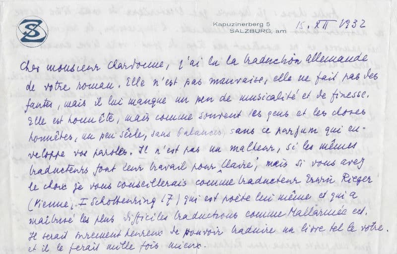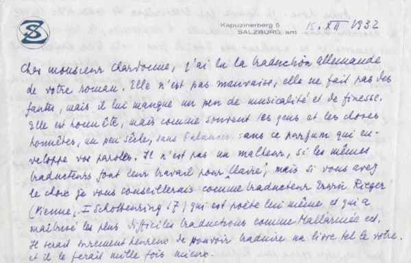Lettre écrite dans un français parfait, dans laquelle le grand écrivain autrichien donne un avis sans concession à son homologue sur ses travaux littéraires. Il s’étonne par ailleurs de l’immense succès de sa biographie sur la reine Marie-Antoinette : « Cher monsieur Chardonne, j’ai lu la traduction allemande de votre roman. Elle n’est pas mauvaise, elle ne fait pas des fautes, mais il lui manque un peu de musicalité et de finesse. Elle est honnête, mais comme souvent les gens et les choses honnêtes, un peu sèche, sans balances, sans ce parfum qui enveloppe vos paroles. Il n’est pas un malheur, si les mêmes traducteurs font leur travail pour « Claire », mais si vous avez le choix je vous conseillerais comme traducteur Erwin Rieger (Vienne, I Schottenring 17) qui est un poète lui même et qui a maitrisé les plus difficiles traductions comme Mallarmé etc. Il serait certainement heureux de pouvoir traduire un livre tel le votre, et il le ferait mille fois mieux. Autre chose : je trouve que l’extérieur de votre livre laisse à désirer dans l’édition allemande. L’impression, la reliure sont très pauvres et ne montrent pas trop de gout : votre livre aurait droit d’être édité avec plus de soin. Demandez de votre éditeur qu’il fasse mieux pour cela : aussi le format est trop grand et mal choisie. J’ai reçu avec beaucoup de joie votre Amour du Prochain : il est sur ma table et sera le cadeau de Noël que je ferai à moi même en le lisant. Je suis très heureux de votre grand succès – d’ailleurs je n’ai pas a me plaindre pour ma part. Ma Marie Antoinette devient le grand succès de la saison, on a vendu 40.000 en deux mois, ce qui est énorme pour un livre à 8 Mark 50 (cinquante francs) dans un moment de détresse extrême. J’étais il y a 8 mois à Strasbourg et Colmar, mais je n’avais pas le temps, d’aller à Paris. Il faut faire son travail et je finis une petite opéra pour Richard Strauss. Fidèlement votre… »