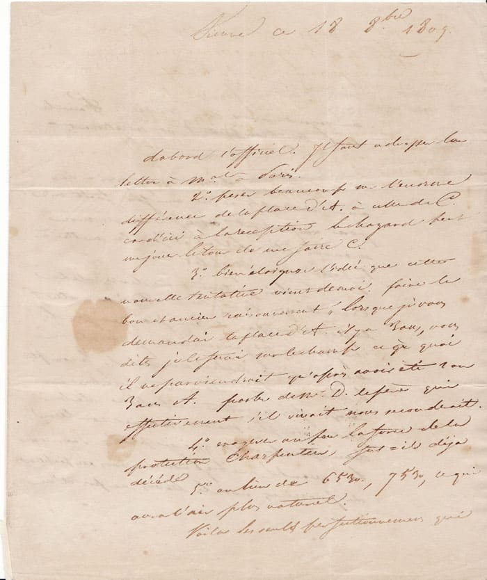 Lettre autographe signée « H.B» à sa sœur Pauline. Vienne 18 octobre 1809; 2 pages ½ in-4. Légères mouillures