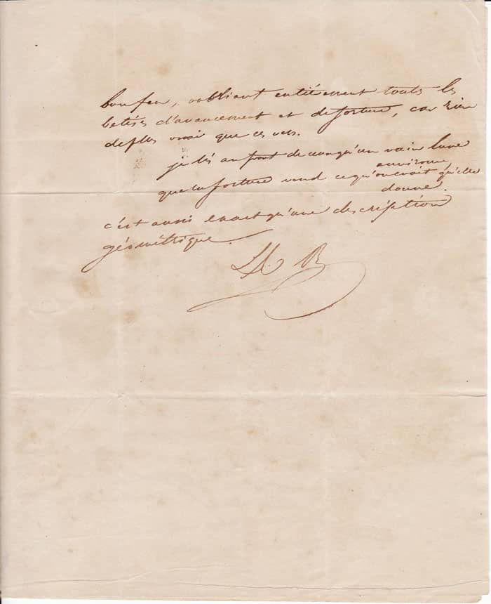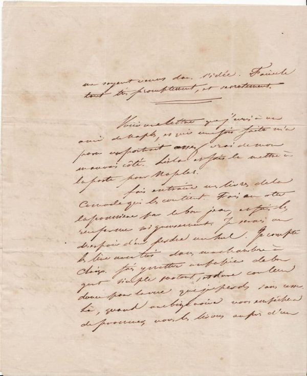 «D’abord l’officiel. Il faut adresser la lettre à Mal [Martial Daru], à Paris. 2° Peser beaucoup sur l’énorme différence de la place d’A [auditeur] à celle de C [commissaire], car d’ici à la réception le hasard peut me jouer le tour de me faire C [commissaire]. 3° Bien éloigner l’idée que cette nouvelle tentative vient de moi ; faire le bon et ancien raisonnement : « Lorsque je vous demandai la place d’A [auditeur], il y a trois ans, vous dîtes : je le ferai sur-le-champ, ce à quoi il ne parviendrait qu’après avoir été deux ou trois ans A [auditeur]. » Parler de M. D [Noël Daru] le père qui, effectivement, s’il vivait, nous seconderait. 4° Exagérer un peu la force de la protection Charpentier, fût-il déjà décédé. 5° Au lieu de 6.530, 7.530, ce qui aura l’air plus naturel. Voilà les seuls perfectionnements qui me soient venus dans l’idée. Faire le tout très promptement et secrètement. Voici une lettre que j’écris à un ami de Naples et qui une fois faite m’a paru un portrait assez vrai de mon mauvais côté. Lis-la et fais-la mettre à la poste pour Naples. Fais extraire mes livres de la commode qui les contient. Fais-en ôter la poussière par le bon Jean et fais-les renfermer soigneusement. Je serais au désespoir d’en perdre un seul. Je compte les lire avec toi dans ma chambre à Claix. Fais-y mettre un papier de bon goût, simple surtout et d’une couleur douce pour la vue que je perds sans cesse. Là, quand une bise noire nous empêchera de promener, nous les lirons auprès d’un bon feu, oubliant entièrement toutes les bêtises d’avancement et de fortune, car rien de plus vrai que ces vers : Je lis au front de ceux qu’un vain luxe environne Que la fortune vend ce qu’on croit qu’elle donne. C’est aussi exact qu’une description géométrique. [Fable de La Fontaine « Philémon et Baucis »] »