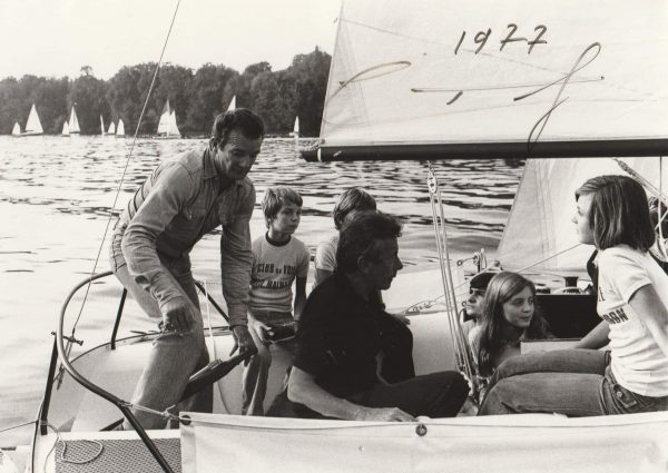 Tirage argentique (17,8 x 12,5 cm) d’Eric Tabarly manœuvrant sur un voilier daté de 1977.