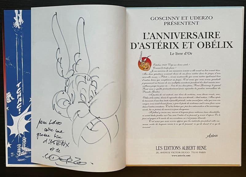Emouvante dédicace d’Uderzo à « Lého », qui était son poseur d’alarme dans sa résidence à Neuilly-sur-Seine. Une des dernières d’Uderzo, malade des mains, qui malgré les réticences de Lého voyant ses difficultés à tenir son feutre, insista, par générosité, pour lui faire cette dédicace.