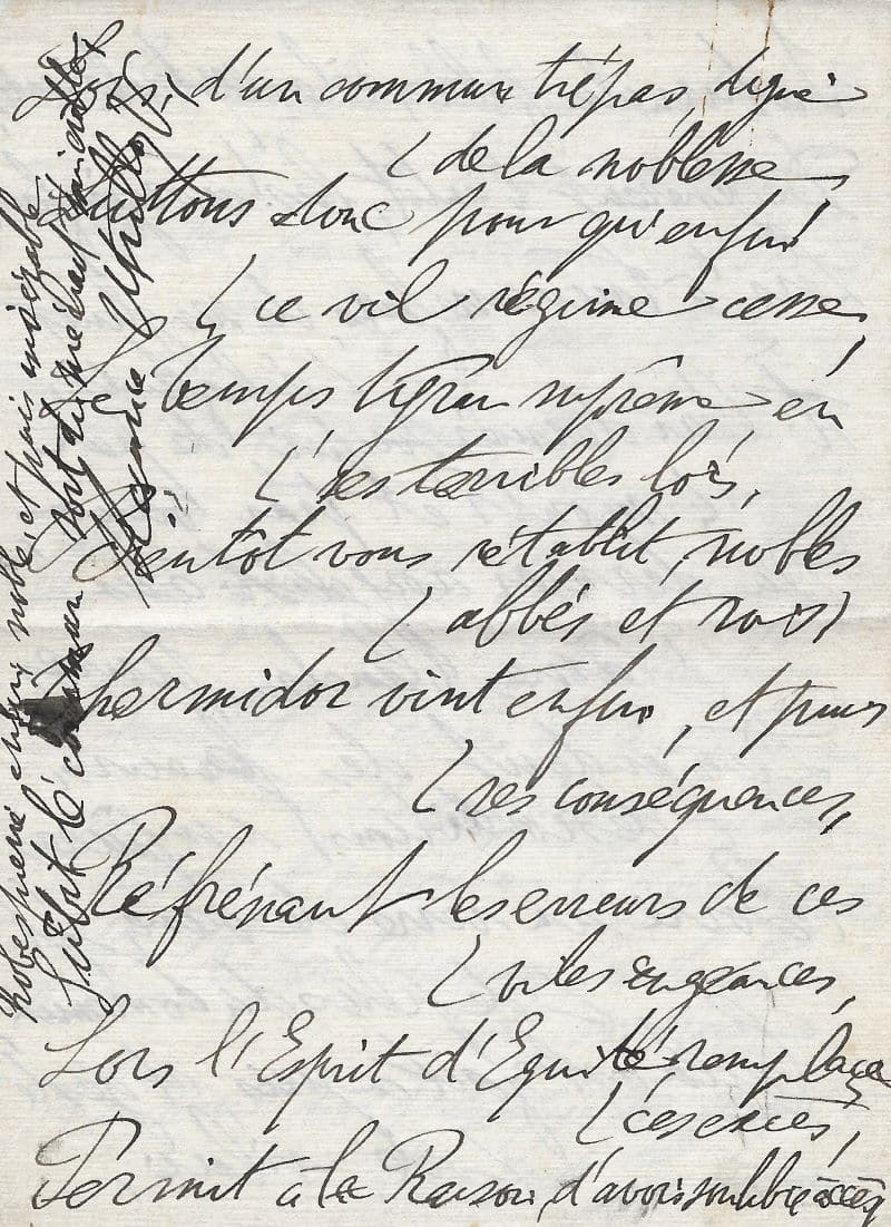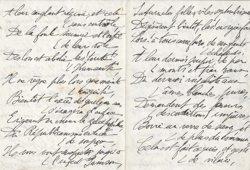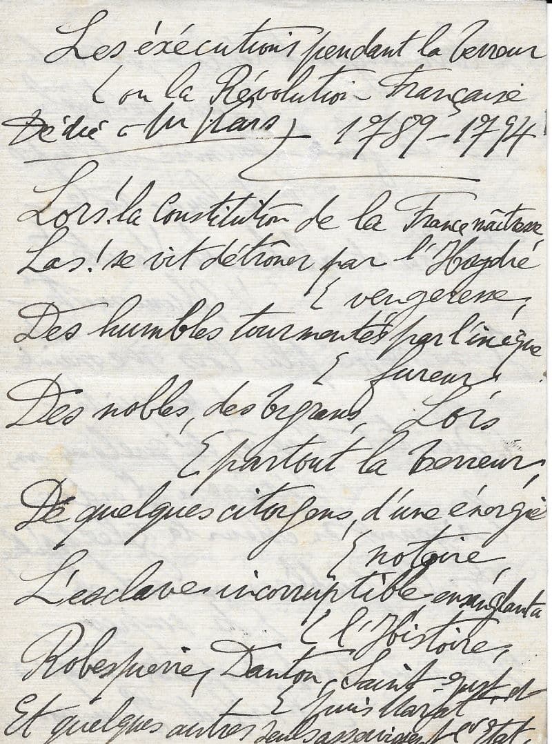 Manuscrit autographe signé, intitulé « Les exécutions pendant la Terreur ou la Révolution – Française 1789 – 1794 » dédié au peintre tchèque Georges Kras. S.l.n.d ; 4 pages in-8°.
