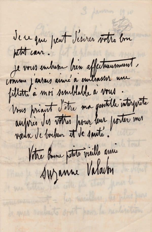 Rare et belle lettre de la célèbre peintre, mère d’Utrillo, répondant aux vœux de la nouvelle année d’étrange manière : « Combien doux fut le plaisir que vous me fîtes avec votre bonne pensée pour moi. J’ai souvent le souvenir de votre si gracieux visage de vierge du moyen âge s’estompant au millieu des peintures modernes ayant l’aire de les mettre dans l’impossibilité, ces peinturlures s’avancer devant cette simplicité de votre figure qui parle tout un passé d’art qui fut. Mais je suis à côté, toujours à côté du début de ma lettre, car cette fin était pour le commencement = les meilleurs, les plus purs de mes souhaits sont la réalisation de ce que peut désirer votre bon petit cœur. Je vous embrasse bien affectueusement, comme j’aurais aimé à embrasser une fillette à moi semblable à vous. Vous priant d’être ma gentille interprète auprès des vôtres pour leur porter mes vœux de bonheur et de santé. Votre bonne pette vieille ami »