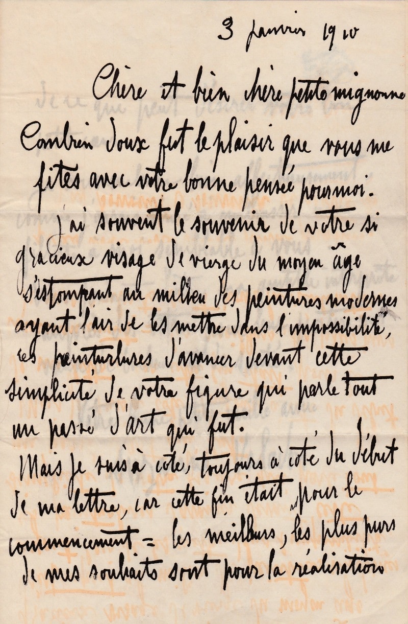Lettre autographe signée à « sa chère et bien chère petite mignonne ». 3 janvier 1910 ; 2 pages in-8°.