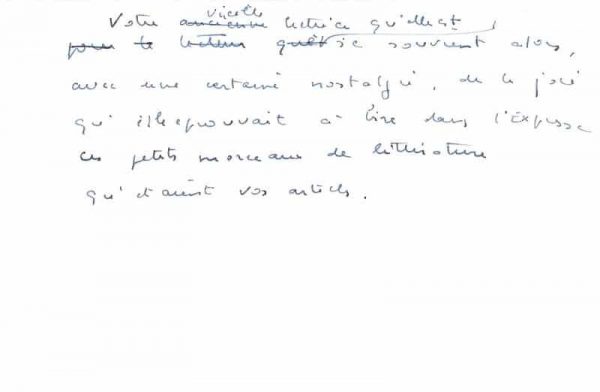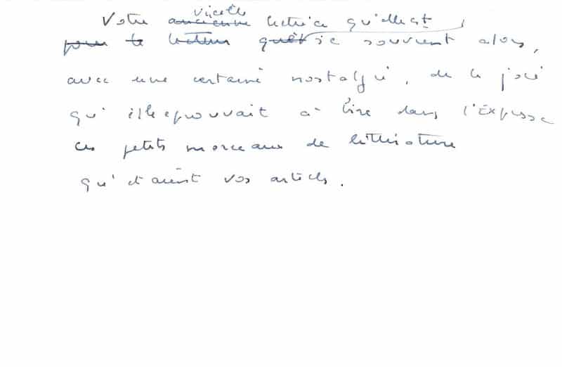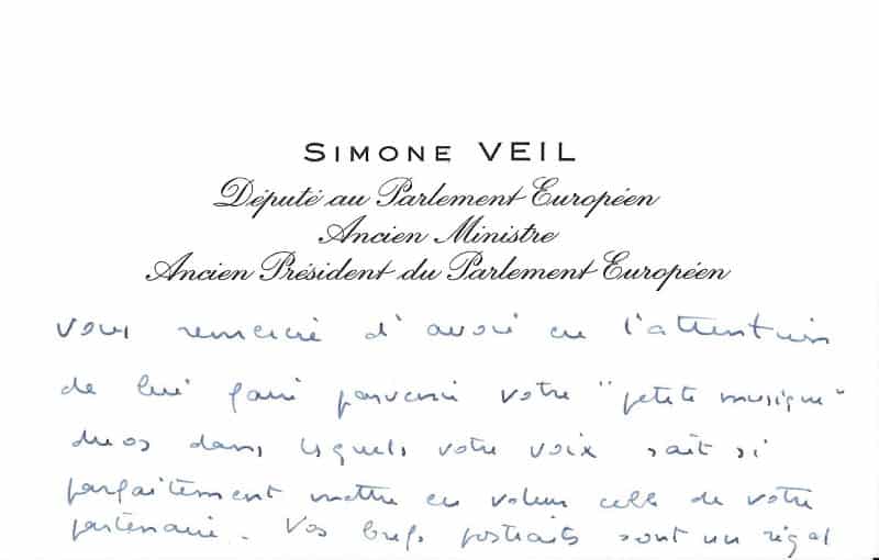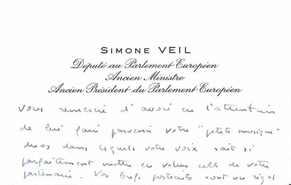 Belle lettre : « [Simone Veil] vous remercie d’avoir eu l’attention de lui faire parvenir votre « petite musique » duos dans lesquels votre voix sait si parfaitement mettre en valeur celle de votre partenaire. Vos brefs portraits sont un régal. Votre vieille lectrice qu’elle est se souvient alors avec une certaine nostalgie, de la joie qu’elle éprouvait à lire dans l’Expresse ces petits morceaux de littérature qu’étaient vos articles. ».
