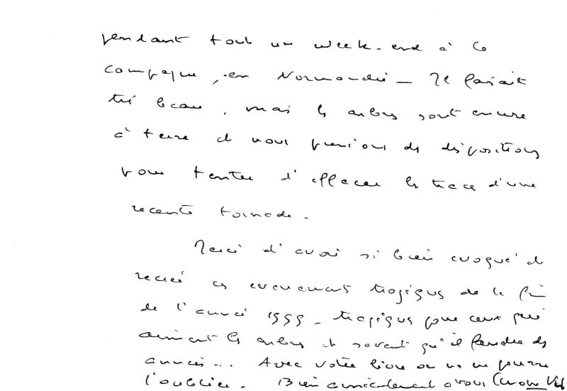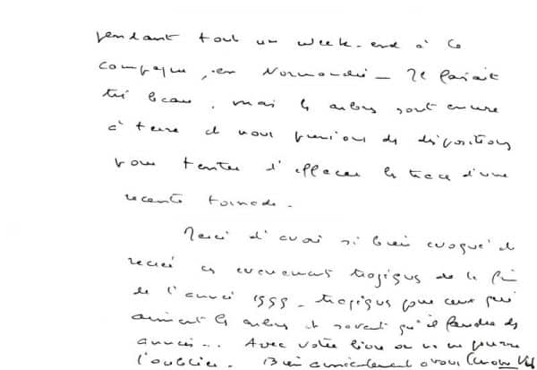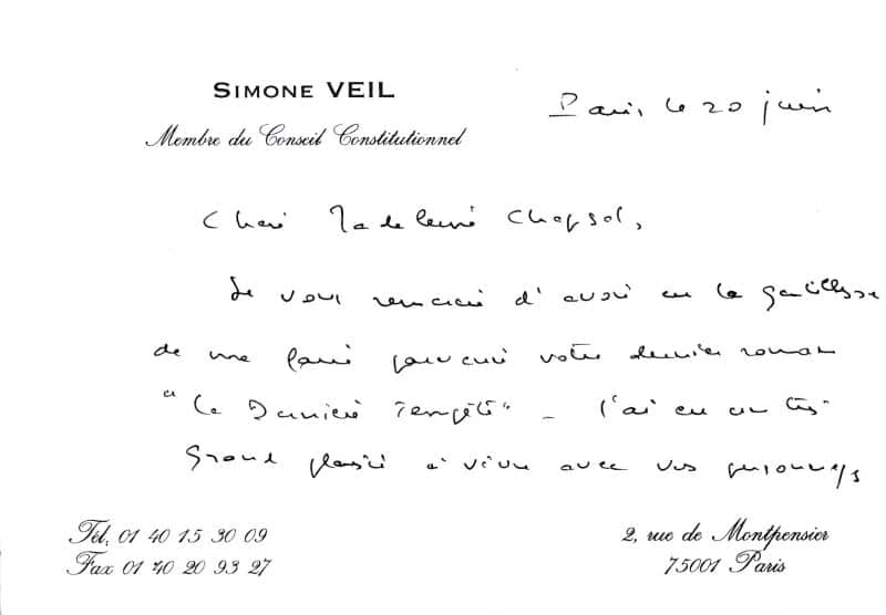 Simone Veil remercie pour ce livre qui a su si bien évoquer la tempête de Noël 1999 : « Je vous remercie d’avoir au la gentillesse de me faire parvenir votre dernier roman « la Dernière Tempête » – J’ai eu un très grand plaisir à vivre avec vos personnages pendant tout un week-end à la campagne, en Normandie – Il faisait très beau, mais les arbres sont encore à terre et nous prenons des dispositions pour tenter d’effacer les traces d’une récente tornade. Merci d’avoir si bien évoqué et recréé ces évènements tragiques de la fin de l’année 1999 – tragiques pour ceux qui aiment les arbres et savent qu’il faudra des années…Avec votre livre nous ne pourrons l’oublier (…) »