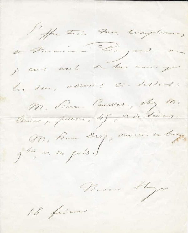 Lettre autographe signée à Monsieur Pizart. 18 février ; 1 page in-4°. Pliures