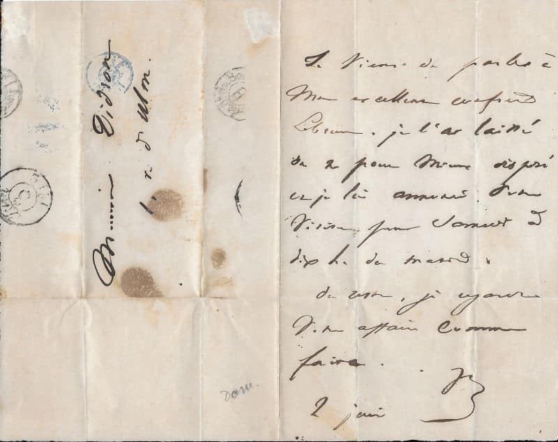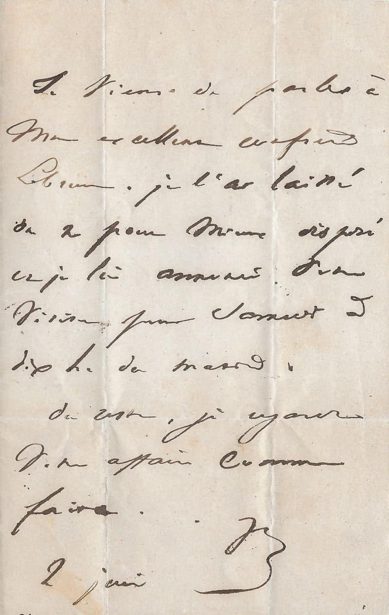 « Je viens de parler à mon excellent confrère Lebrun. Je l’ai laissé (…) disposé car je l’ai assuré d’une visite pour samedi 5 six h. du matin. Je regarde votre affaire comme faite… »