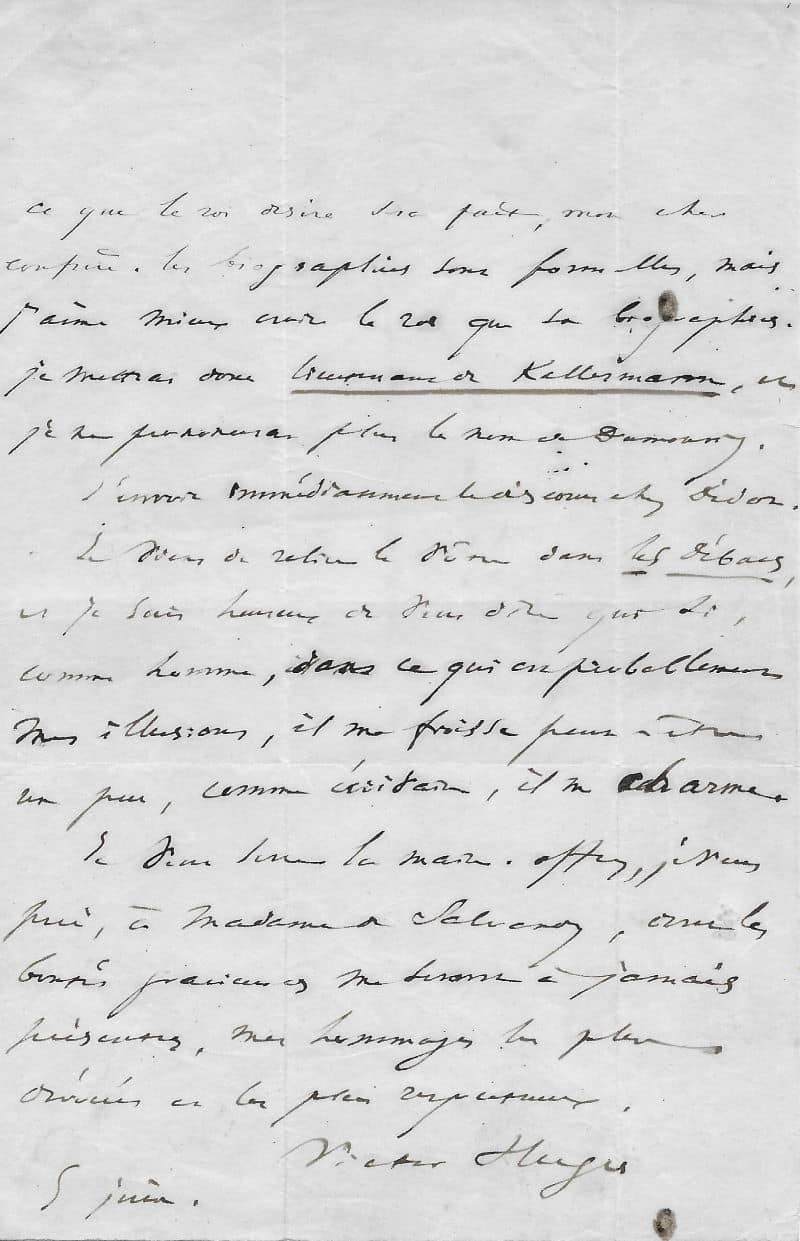 Victor Hugo accepte, à contre cœur, de corriger son discours de réception à l’Académie française suite au vif mécontentement de Louis-Philippe qui n’a pas apprécié d’avoir été qualifié, dans son discours public du 3 juin, d’« aide de camp de Dumouriez ». Il doit revoir sa copie à l’impression du texte en reformulant sa phrase par « lieutenant de Dumouriez et de Kellermann » aux victoires de Valmy et de Jemmapes : « Ce que le roi désire sera fait, mon cher confrère. Les biographies sont formelles, mais j’aime mieux croire le roi que ses biographies. Je mettrai donc lieutenant de Kellerman, et je ne prononcerai plus le nom de Dumouriez. J’envoie immédiatement le discours chez Didot. Je viens de relire le vôtre dans les Débats [réponse de Salvandy au discours de réception de Hugo en séance publique du 5 juin], et je suis heureux de vous dire que si, comme homme, dans ce qui est probablement mes illusions, il me froisse peut-être un peu, comme écriture, il me charme. Je vous serre la main. Offrez, je vous prie, à Madame de Salvandy, dont les bontés gracieuses me laissent à jamais prisonniers, mes hommages les plus avérées et les plus respectueuses… »