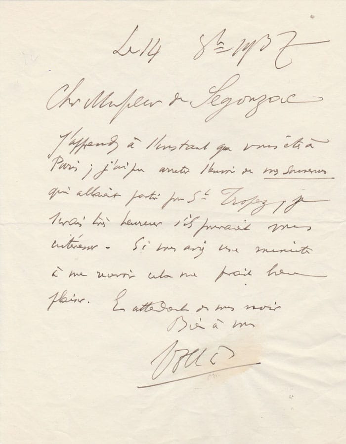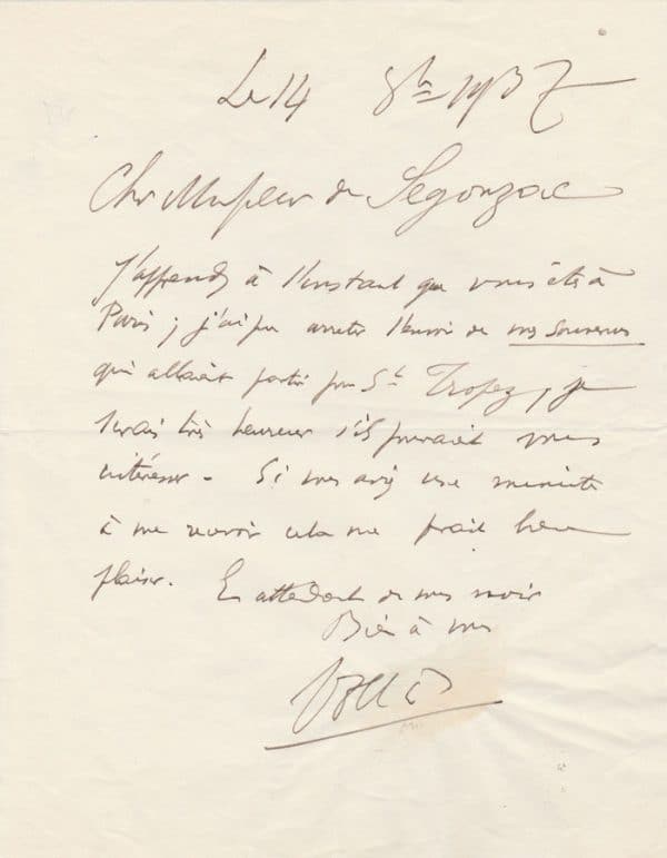 Vollard serait heureux de présenter son autobiographie « souvenir d’un marchand de peinture » : «J’apprends à l’instant que vous êtes à Paris ; j’ai pu arrêter l’envoi de mes souvenirs qui allaient partir pour St Tropez, je serais très heureux s’ils pouvaient vous intéresser. Si vous avez une minute à me recevoir cela me ferait très plaisir…»
