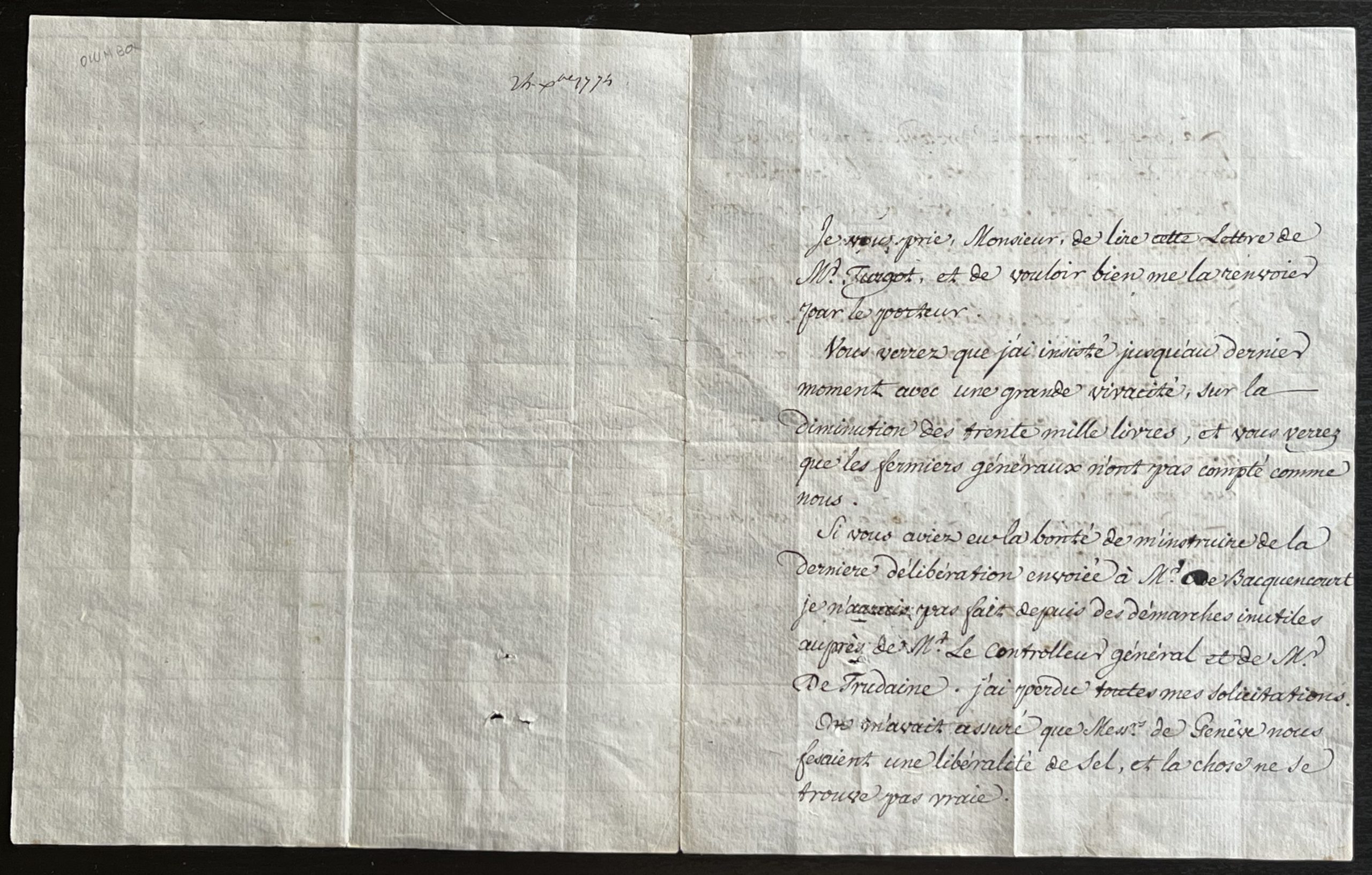 Belle lettre relative à l’édit pris par le contrôleur général des finances Turgot, libérant le pays de Gex de l’emprise de la Ferme générale pour le recouvrement de l’impôt dans les recettes royale, cette compagnie financière se faisait rémunérer souvent en pot-de-vin. Le destinataire est très probablement son ami et voisin, Louis-Gaspard Fabry (1720-1791), subdélégué de l’Intendance et maire de Gex.