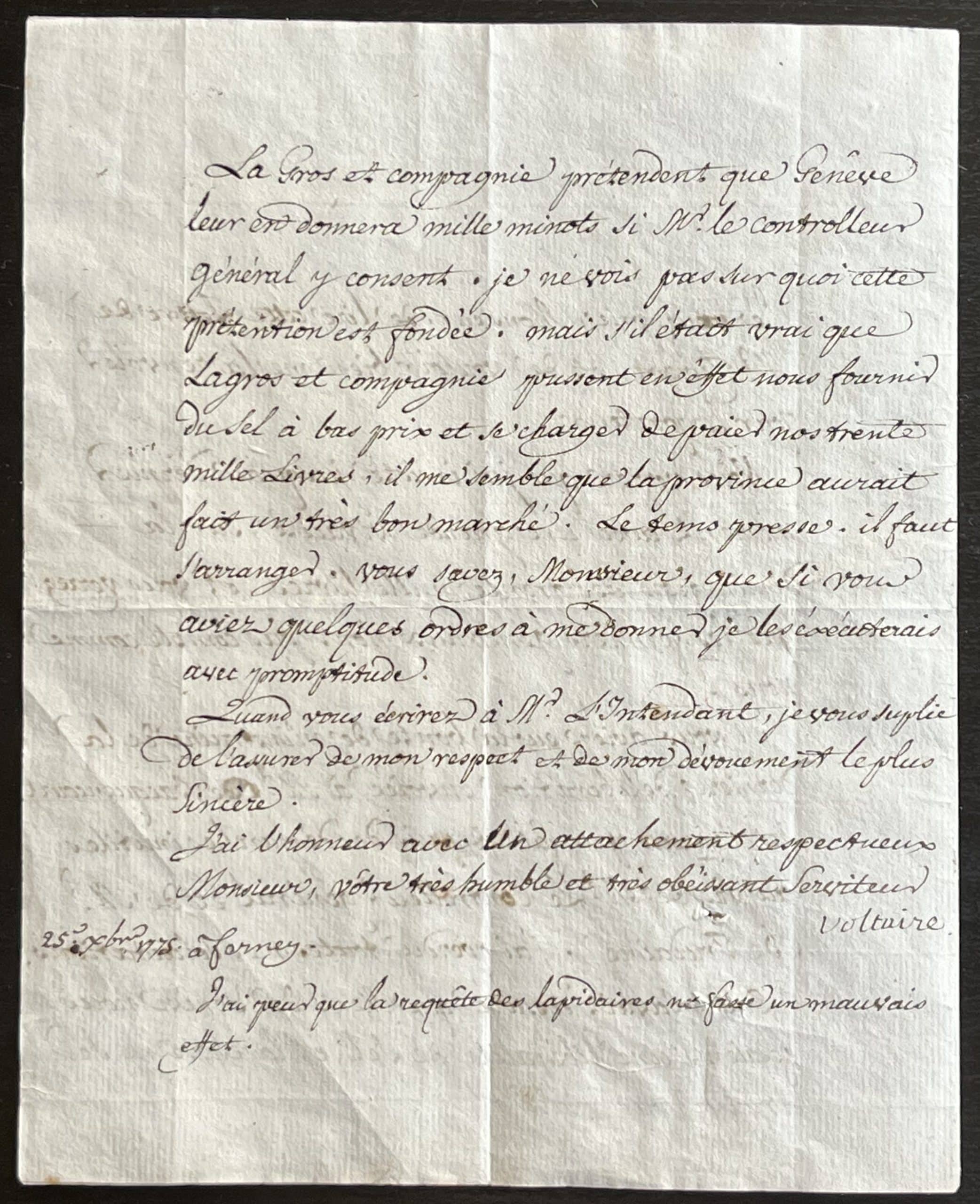 Il lui fait parvenir une lettre reçue de M. Turgot concernant l’application de l’édit et l’instruit de l’action qu’il compte mener pour défendre l’édit à l’aube de ses 82 ans : « Vous verrez que j’ai insisté jusqu’au dernier moment avec une grande vivacité, sur la diminution des trente mille livres, et vous verrez que les fermiers généraux n’ont pas compté comme nous. Si vous aviez la bonté de m’instruire de la dernière délibération envoiée à Mr de Bacquencourt [Intendant du pays de Gex] je n’aurais pas fait depuis des démarches inutiles auprès de Mr le contrôleur général et de Mr Trudaine [Jacques Turgot et Philibert Trudaine de Montigny]. J’ai perdu toutes mes solicitations. On m’avait assuré que Messrs de Genève nous fesaient une libéralité de sel, et la chose ne se trouve pas vraie. La Gros et compagnie prétendent que Genève leur en donnera mille minots si Mr le controlleur général y consent. Je ne vois pas sur quoi cette prétention est fondée. Mais s’il était vrai que Lagros et compagnie pussent en effet nous fournir du sel à bas prix et se charge de paier nos trente mille livres, il me semble que la province aurait fait un très bon marché. Le temps presse. Il faut s’arranger. Vous savez, Monsieur, que si vous aviez quelques ordres à me donner je les exécuterais avec promptitude. Quand vous écrirez à Mr l’Intendant, je vous suplie de l’assurer de mon respect et de mon dévouement le plus sincère. J’ai l’honneur avec un attachement respectueux, Monsieur, votre très humble et très obéissant serviteur. Voltaire ».