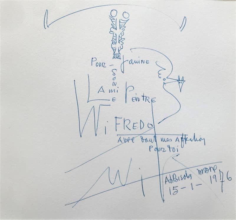Dessin dédicacé (Pour Janine son ami le peintre Wifredo Avec tout mes affection pour toi.), signé et daté (Albisola Mare 15-1-1976)