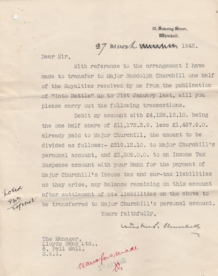 Pendant la guerre, Churchill apporte une aide financière à son fils le Major Randolph connu pour ses dettes de jeux : «Suivant notre accord de verser la moitié des royalties reçues au Major Randolph Churchill suite à la publication de « Into Battle » le 31 janvier dernier, pourriez vous s’il-vous-plait y donner suite. Débitez mon compte de £4,128.12.10. étant la moitié des £11,172.3.9. déduction faite des £1,457.9.0. déjà versés au Major Churchill, ce montant devant être divisé comme suit : -£319.12.10. sur le compte personnel du Major Churchill, et £3,809.0.0. sur un compte en attente avec votre banque qui sera affecté au paiement de l’impôt sur le revenu et de la taxe additionnelle du passif quand elles se présenteront. Tout ce qui reste sur ce compte après règlement du passif est transféré sur le compte personnel du Major Churchill…»