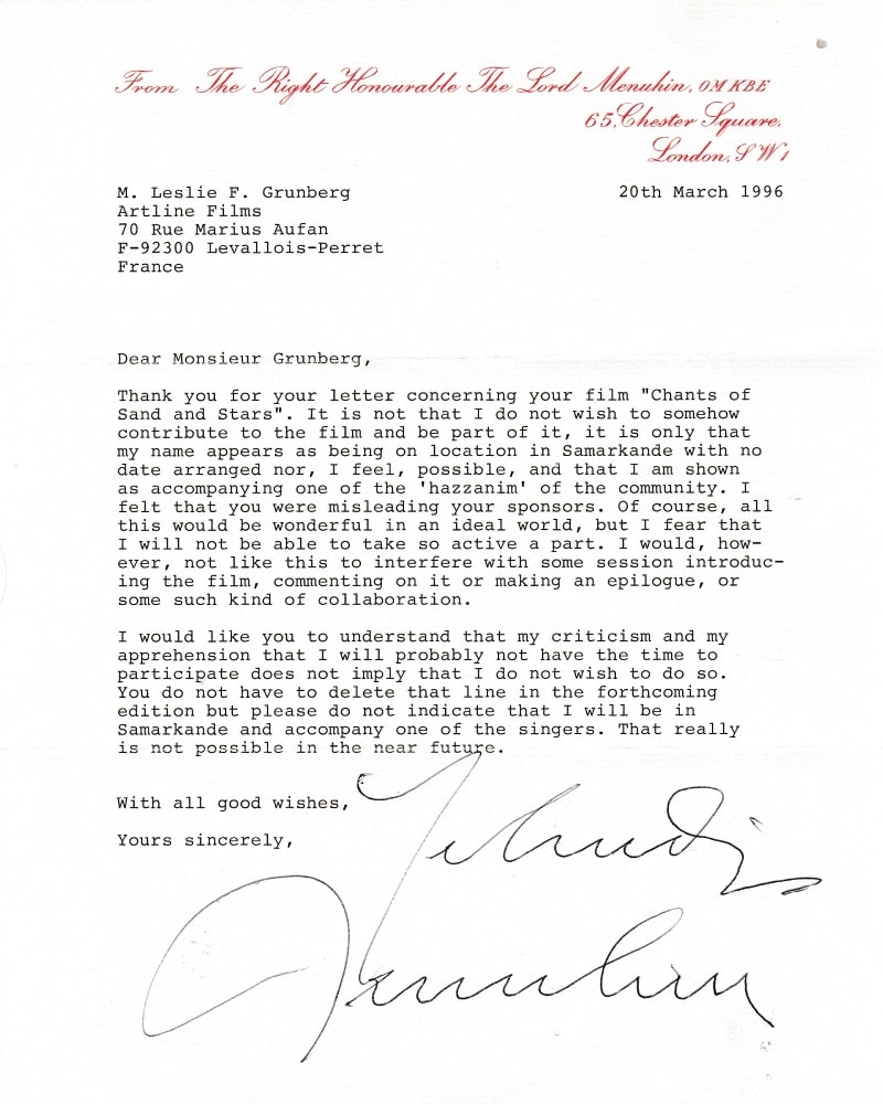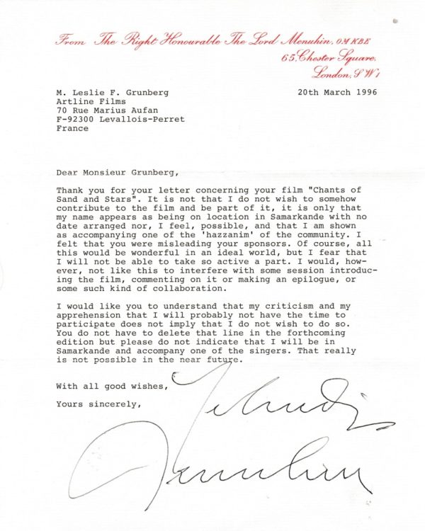 Menhuin ne souhaite pas participer au film Samarkande et en explique les raisons : « Thank you for your letter concerning your film « Chants of Sand ans Stars ». It is not that i do not wish to somehow contribute to the film and be part of it, it is only that my name appears as being on lacation in Samarkande with no date arranged nor, i feel, possible, and that i am shown as accompanying one of the ‘hazzanim’ of the community. I felt that you were misleading your sponsors. Of course, all this would be wonderful in an ideal world, but i fear that i will not be able to take so active a part. I would, however, not like this to interfere with some session introducting the film, commenting on it or making an epilogue, or some such kind of collaboration. I would like you to understand that my criticism and my apprehension that i will probably not have the time to participate does not imply that i do not wish to do so. You do not have to delete that line in the forthcoming edition but please do not indicate that i will be in Samarkande and accompany one of the singers. That really is not possible in the near future… »