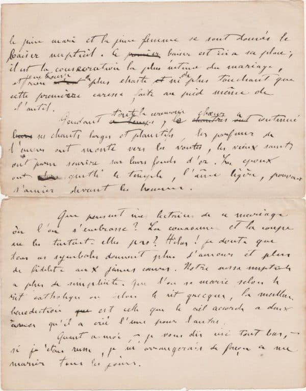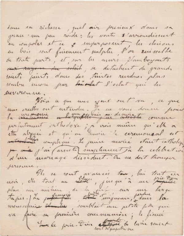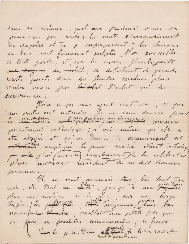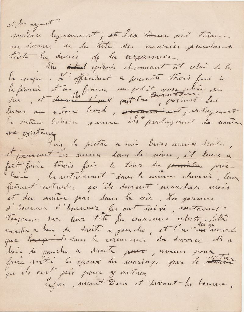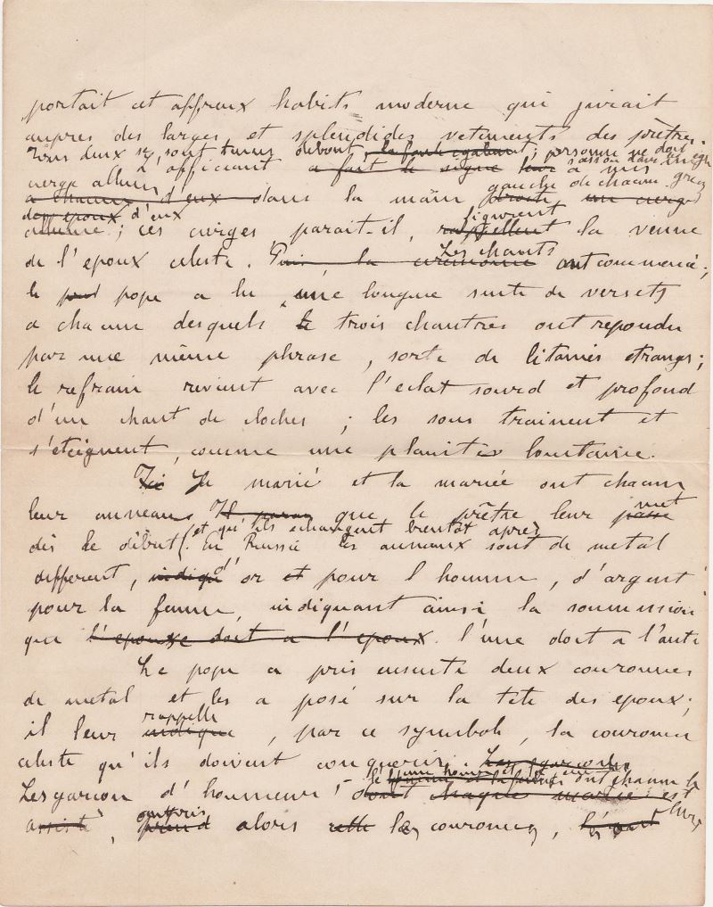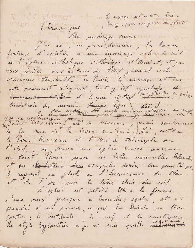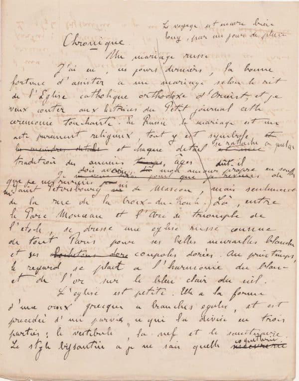 Manuscrit biffé, raturé, avec nombreuses corrections, paru dans le Petit Journal du 6 février 1865. Le jeune Emile Zola dont le tout premier roman « Contes à Ninon » a reçu un bel accueil, gagne sa vie en publiant des articles et des nouvelles dans le Petit Journal, la Vie parisienne, le Salut public de Lyon entre autres. Dans cette chronique il partage avec ses lectrices sa participation à un mariage orthodoxe en plein cœur de Paris :